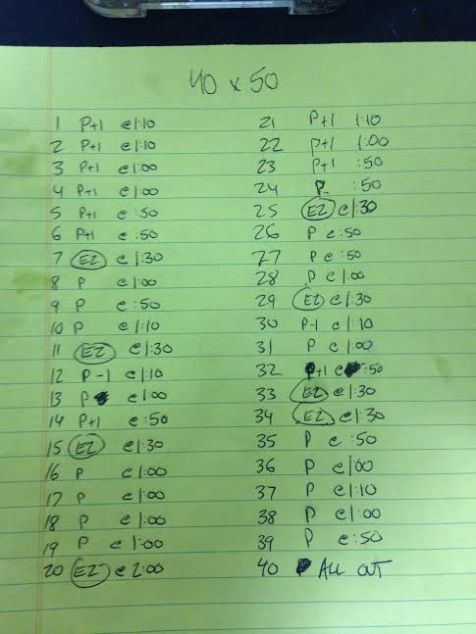 Swimmers were told we were doing 40 x 50. A coach wrote the pace expectation and the interval on a dry erase board, changing it each 50. This meant that the swimmers had no idea if the next 50 would be easy, at 200 pace minus 1 second, at 200 pace, or at 200 pace +1. Swimmers could choose any stroke for any 50. Here is some of the feedback afterwards…