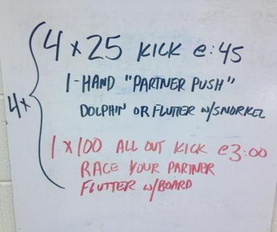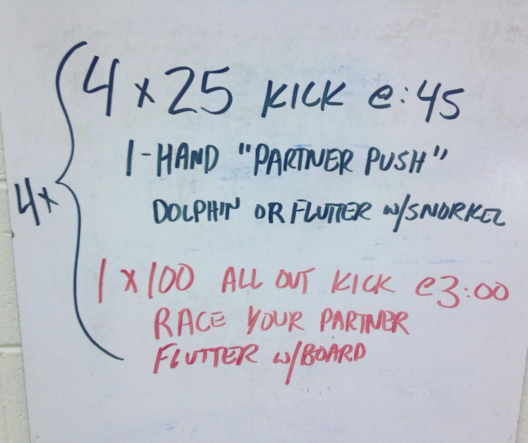 Swimmers partnered up. For the first part of the set, they push their partner (who is in a streamlined position) with one hand. Then they race their partner in an all out 100 flutter kick. The 100 was handicapped based on a “best average” kick set earlier in the week, meaning that one partner got a head start over the other.