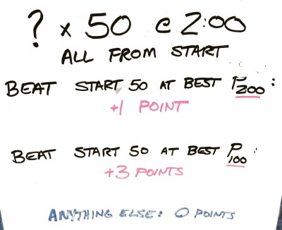 At the end of practice, we split our group into two squads, and faced off in a team points competition. We ended up doing eight 50s, and in the last two rounds actually doubled the point values, just to increase the incentive a bit when they were really tired.
