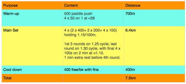 Here’s a session we did with national open water age groupers in the week before a 7.5km race, to give them a feel for holding race pace.