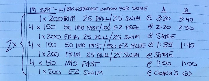 The first three 200s are FRIM = IM with Free instead of Fly. All fast 50s timed to the feet.