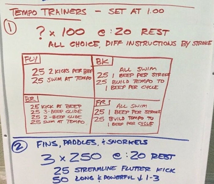 We have enough Tempo Trainers for half of our top group to use them at the same time, so I devised this two-station set. The set in red is designed to use the Tempo Trainers to challenge their ability to hold Distance Per Cycle at race speed. The set in blue encouraged long, kick-driven strokes.