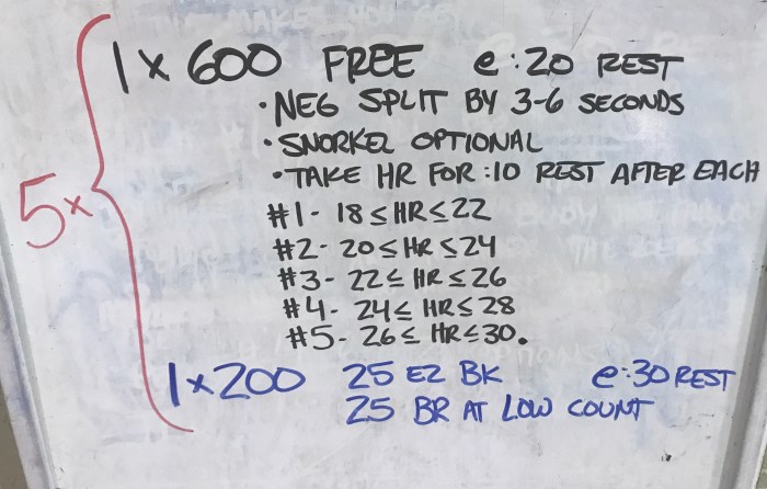 This distance set was designed for a medium intensity day — I wanted the swimmers to descend the 600s without going all out. It was also an opportunity to get a better individual sense of how effort relates to heart rate.