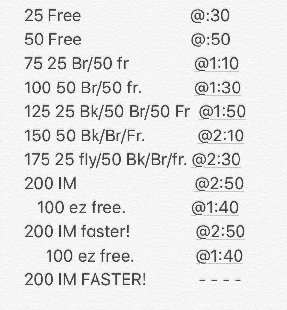 SCM. This one took an old concept of building up the distance to a 200 IM and added a few descending 200 IMs to finish with a punch!