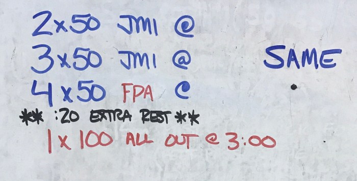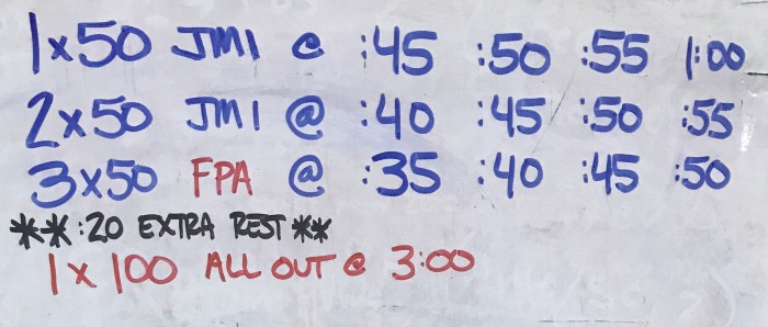 SCM. This set came in three parts and really challenged our swimmers. They could do back or breast for all three parts, and were instructed to choose the interval that made the FPA (fastest possible average) set challenging. We did 2 rounds.