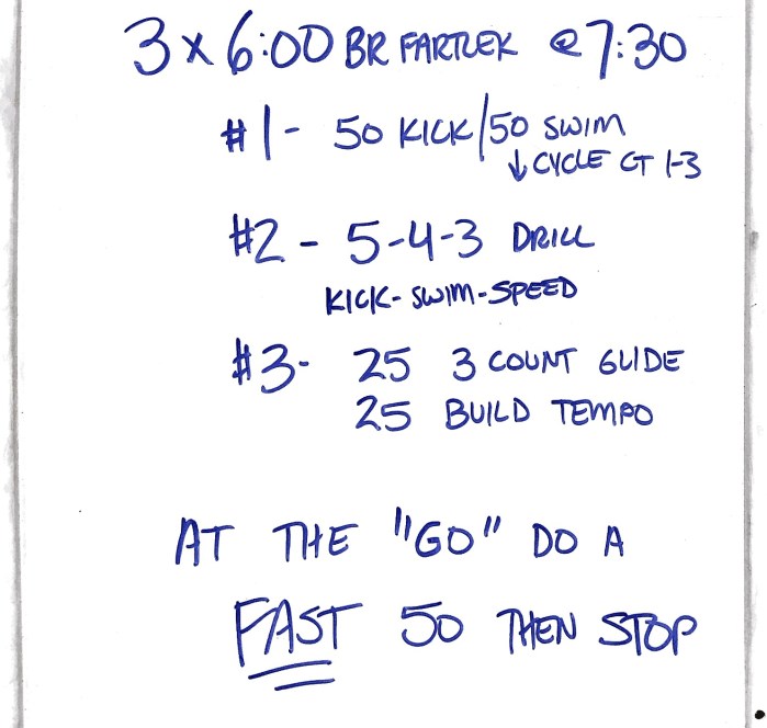 These non-stop 6:00 swims repeated the instructions within the 6:00. At about 5:00, coach would yell “Go!” signifying a FAST 50 breast starting immediately.