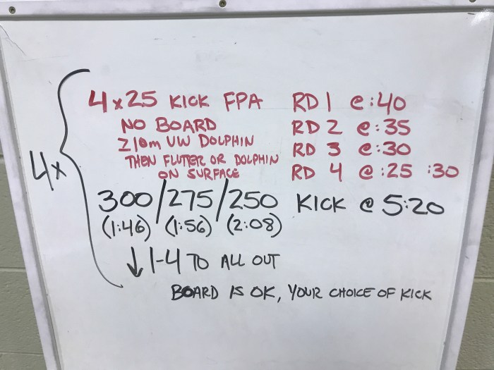 This kick set was able to provide a good challenge for everyone in our group, regardless of their kicking ability. Intervals were the same across the group for the 25s until the last round. Swimmers chose their longer distance based on kicking ability.