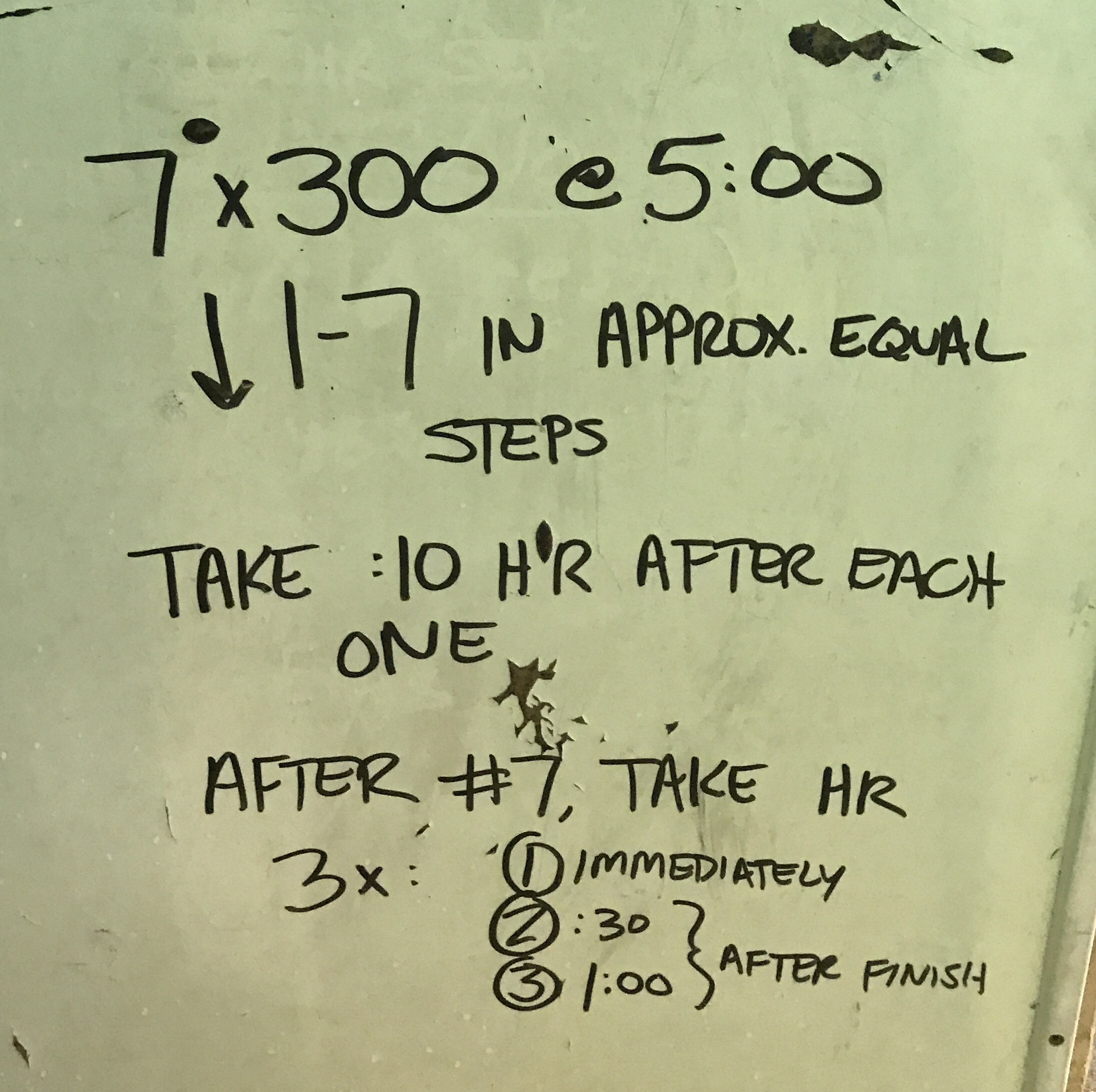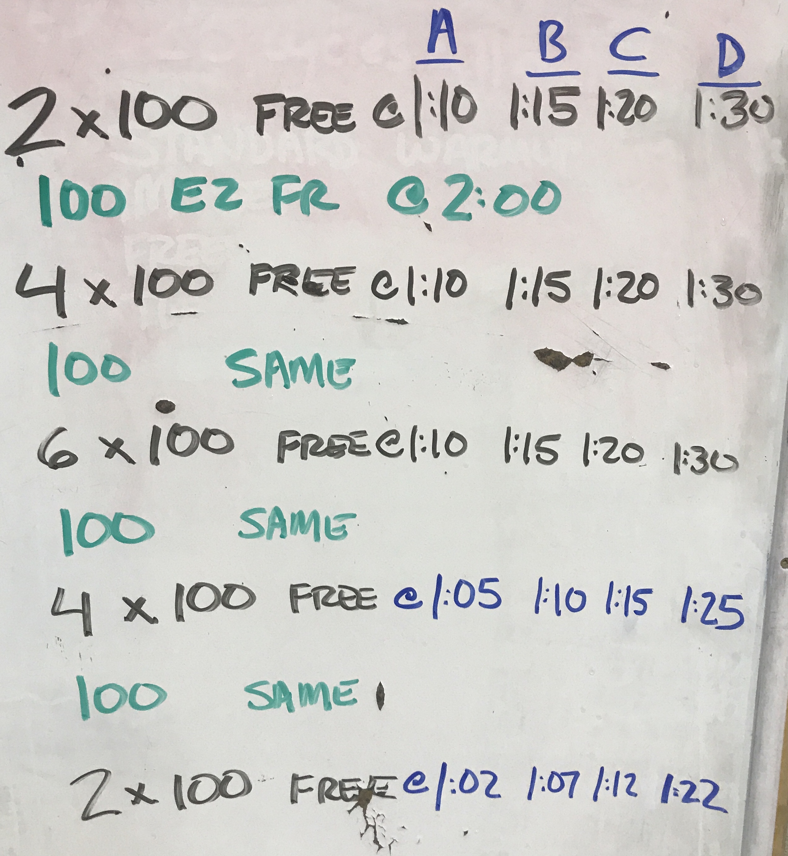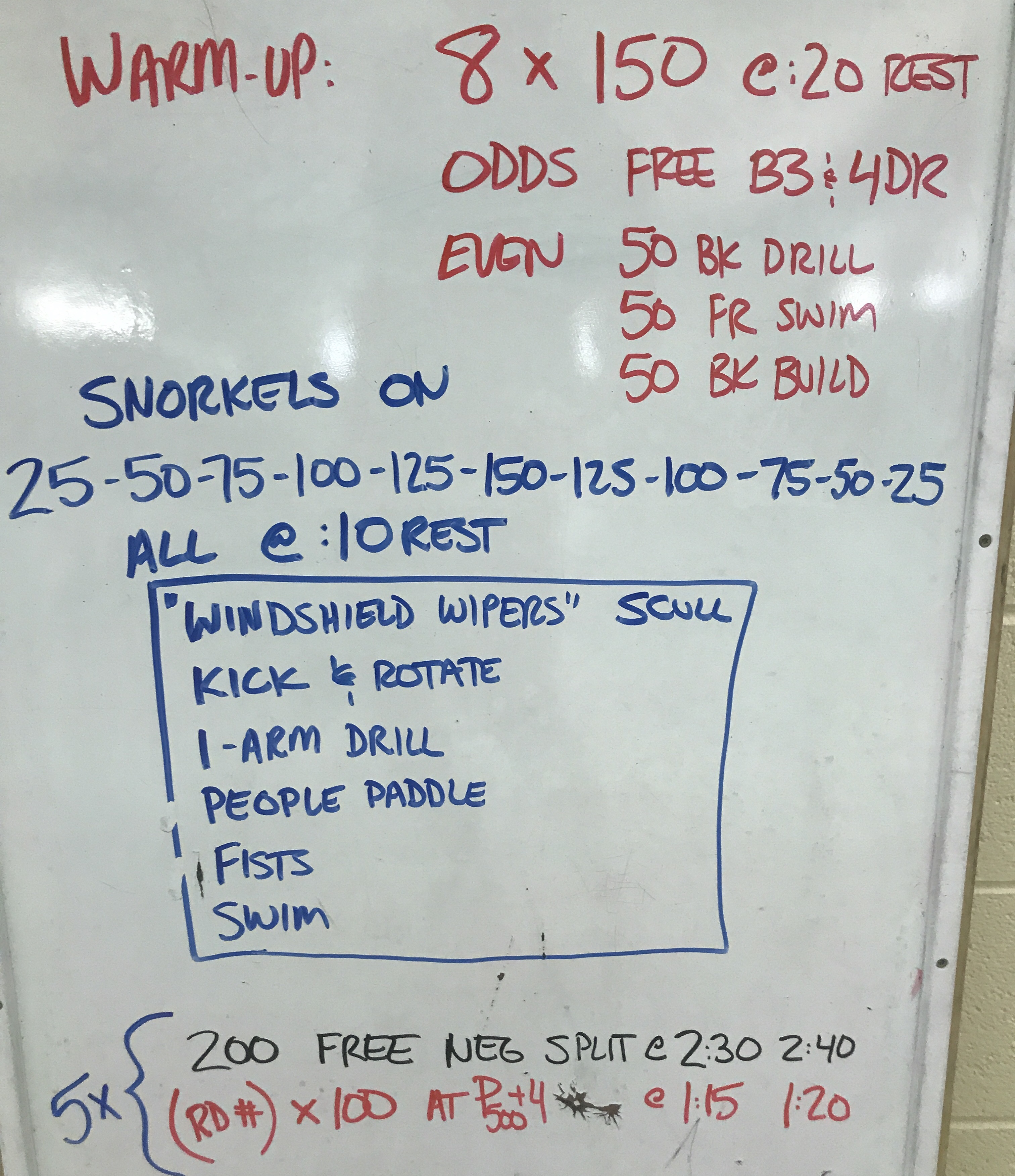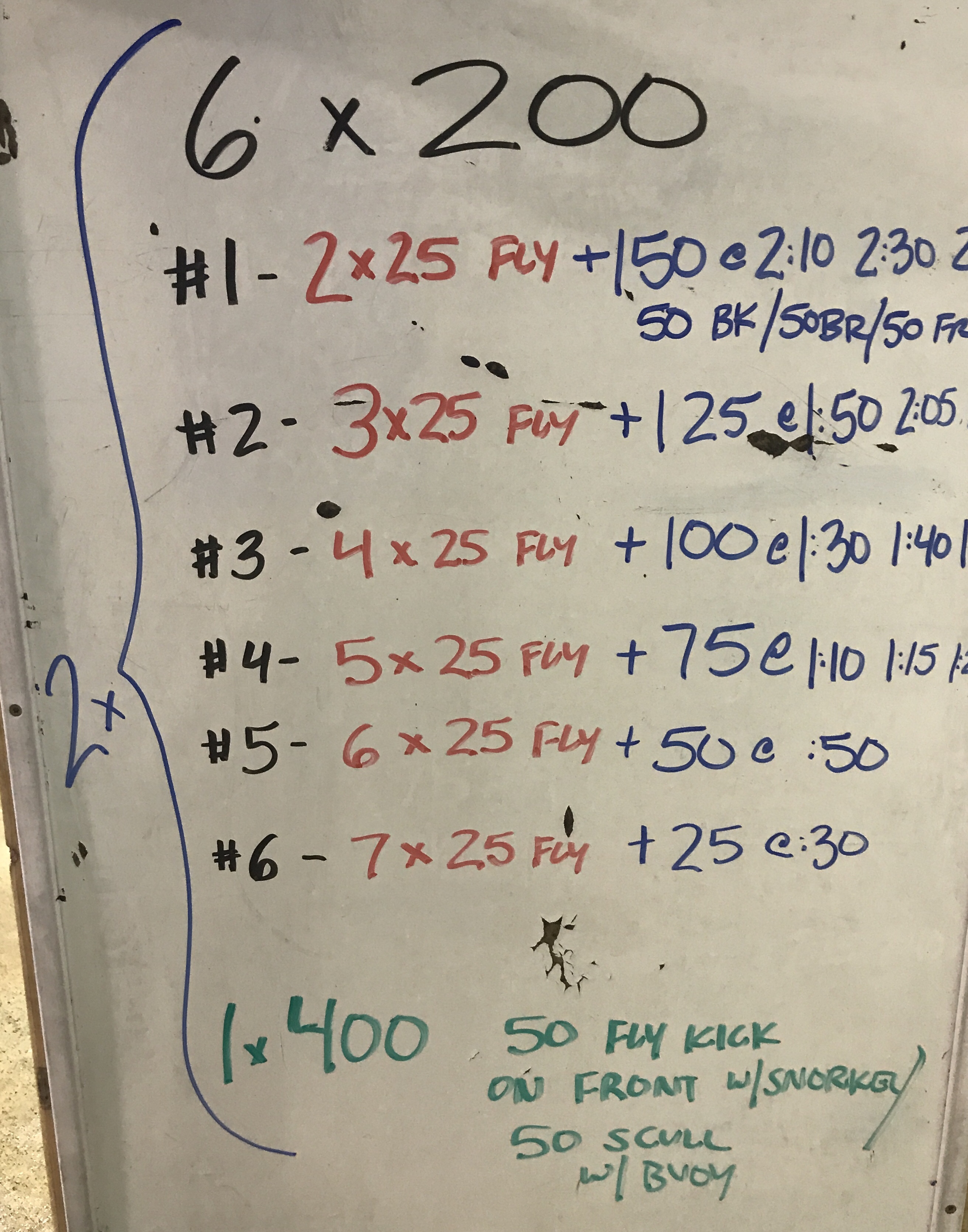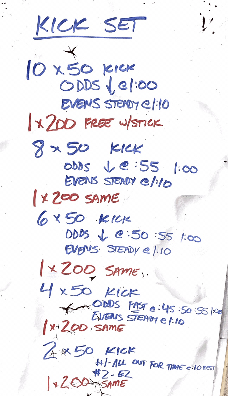 We ended up doing between eight and twelve 50s in each of the three sets. The top part of our group went on the intervals listed — the rest went on an interval :05 slower. My intent with the 50s was to let fatigue build gradually through repetition at speeds that would give them ~ :05 rest. Once I sensed we were starting to wobble a bit, I gave the “final 50” warning. We did a last 50 and then launched into the timed swim of the next stroke.