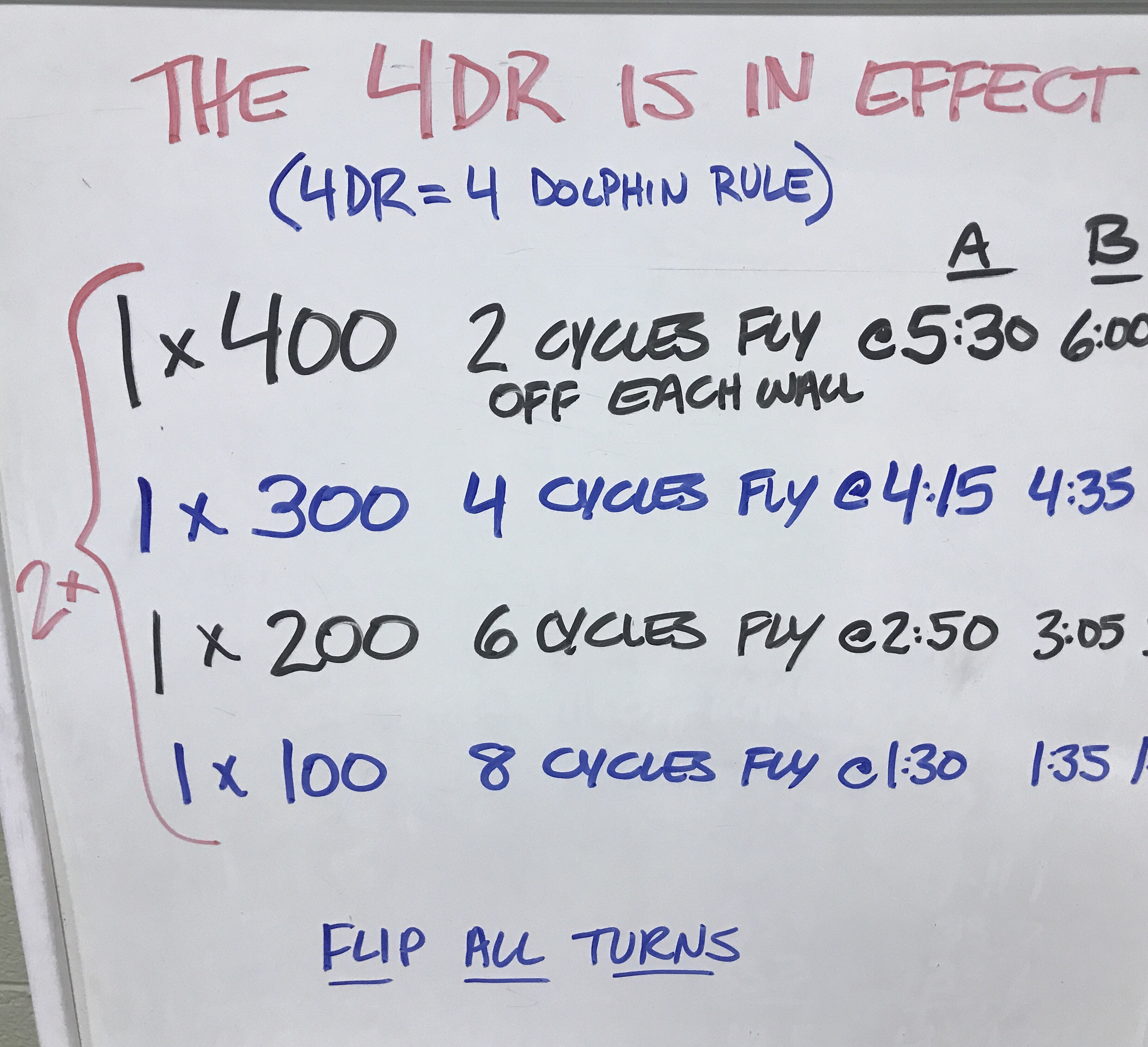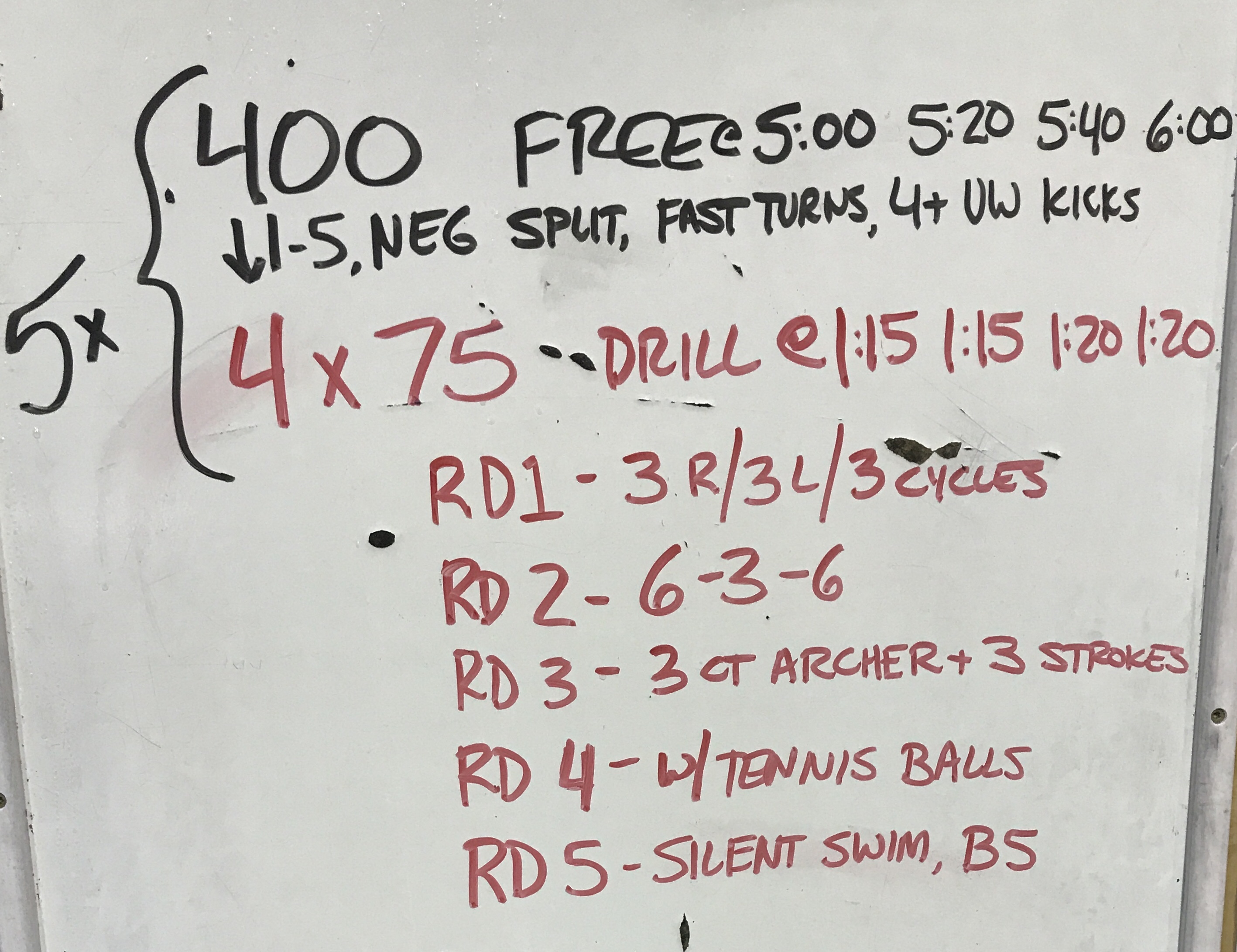 For the last set of 100 IMs, we did a little “stopwatch roulette ” (start a watch, then stop randomly — use the number in the hundredths pace) to determine how many we did. We got 4 – so we did three from a push and one off the blocks.