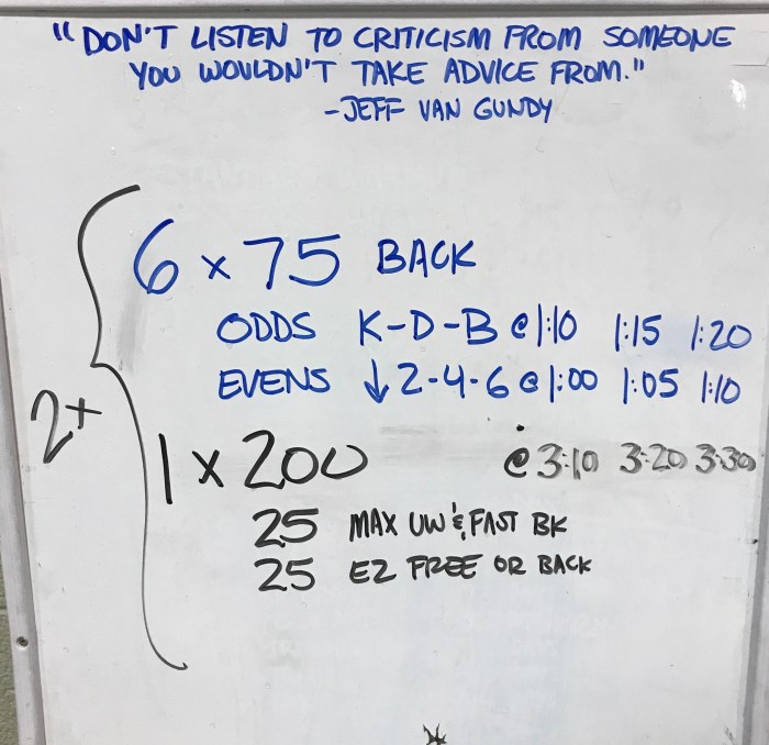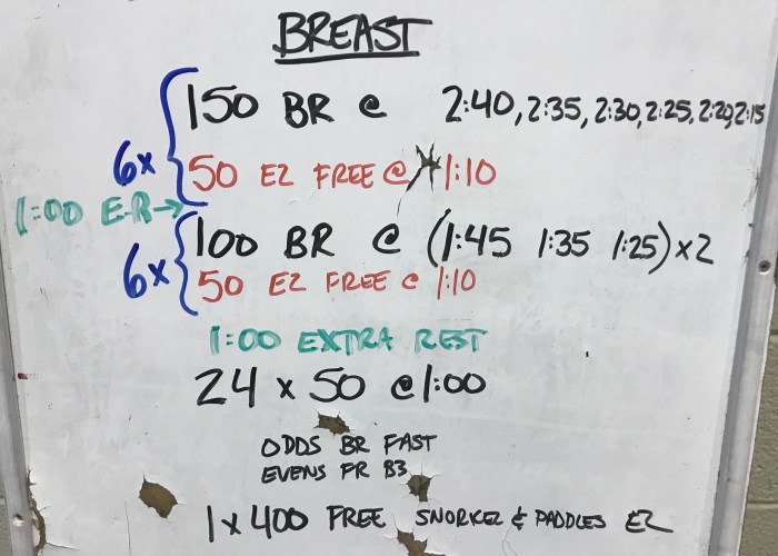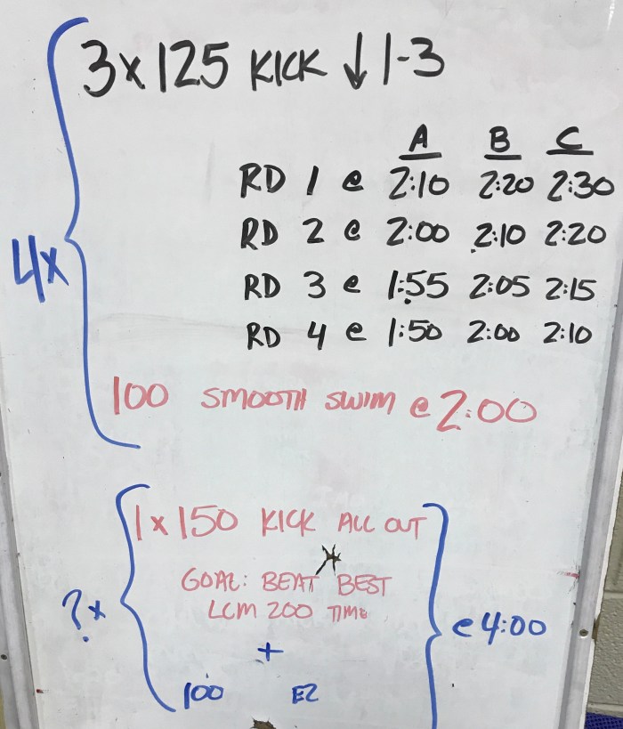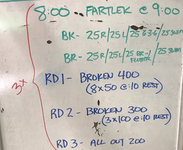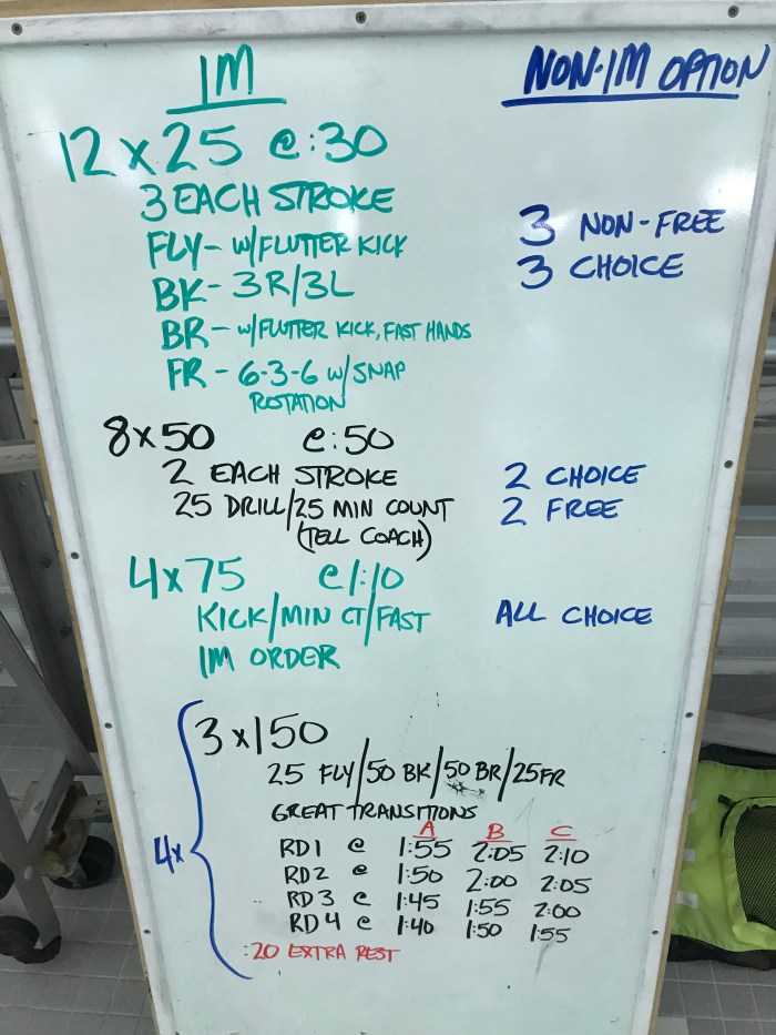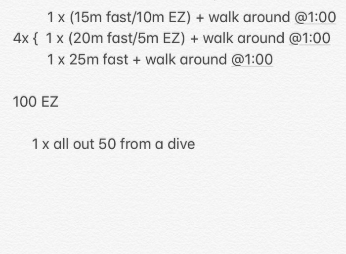 Our pool has a 12m diving well that I like to use for underwater kicking. It sits adjacent to the long course lanes. Today we made it part of a two-station butterfly rotation. We did each station 3x with the instructions on the fly station changing each time. Having the two stations allowed our arms and shoulders to recover a bit between rounds of 50s fly. Each station was 12 minutes in duration, so this set took almost 80 minutes when factoring in transition time.