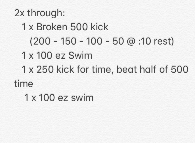3x (2x (all UW kick: 25@:20, 50@:30, 75@:40) + 100 ez swim @1:00)