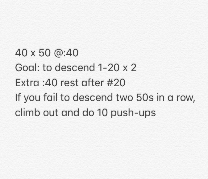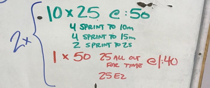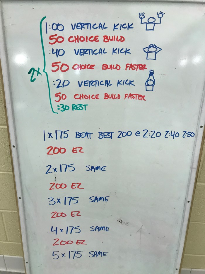 This set prompted a discussion about how we judge success/failure during a set. Most often, there is a prescribed speed an interval that helps guide our effort level. On this one more than most, I wanted to push our swimmers to the verge of “failure” in the conventional sense of missing an interval. Post-set, we redefined success as having pushed ourselves to the limit and actually finding the point of failure.