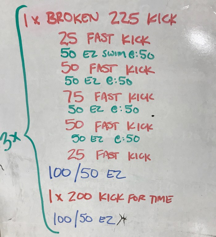 SCM. For the broken 225 kick, we got our total kicking time (total time minus 3:20 for the 4 x 50 @:50). The goal on the following 200 was to beat that broken 225 time by at least 10 seconds.