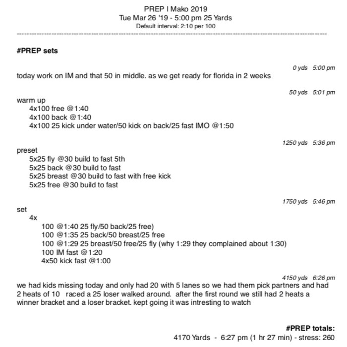 Pre and Quality – Set we did 2 times – 1 in Stroke (not Free) and 1 in Second Stroke/Free or IM.
