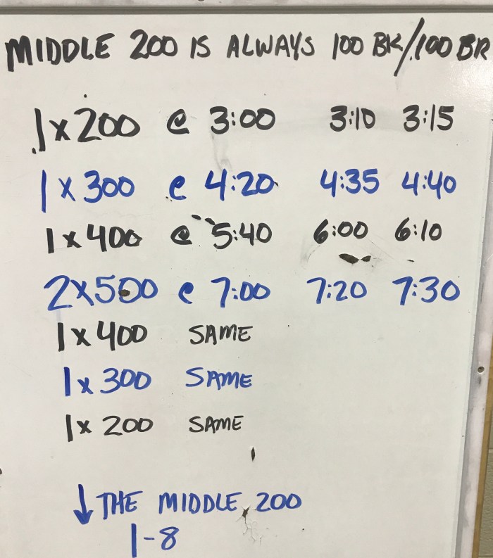 This set was intended to focus on the middle part of our IM swims. Every swim has a 100 back/100 breast in the middle. That 200 is the focus of the set, and we aimed to descend that 200 across the 8 swims. Any distance before or after that 200 is freestyle. We did this in a SCM pool.
