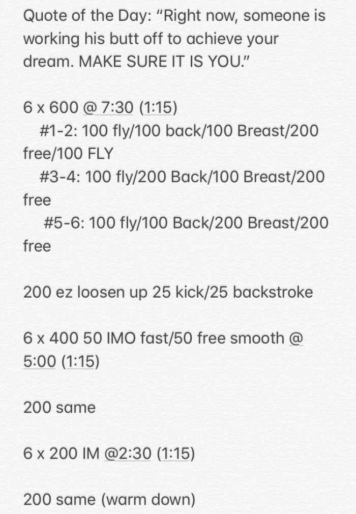 6 x 75 @ 4:30 – [Two in a Row The Same IM is Two Fly/Btk/BR, Two BK/BR/FR]