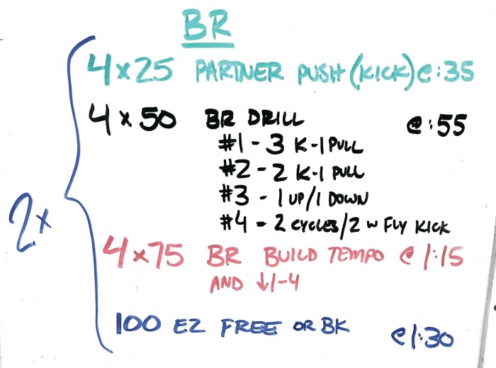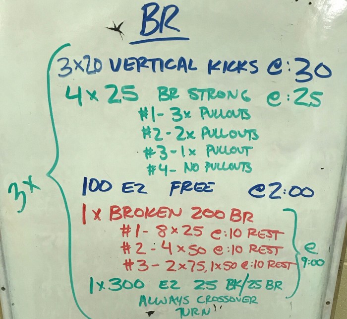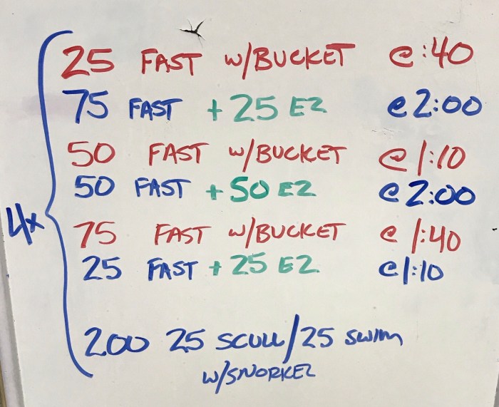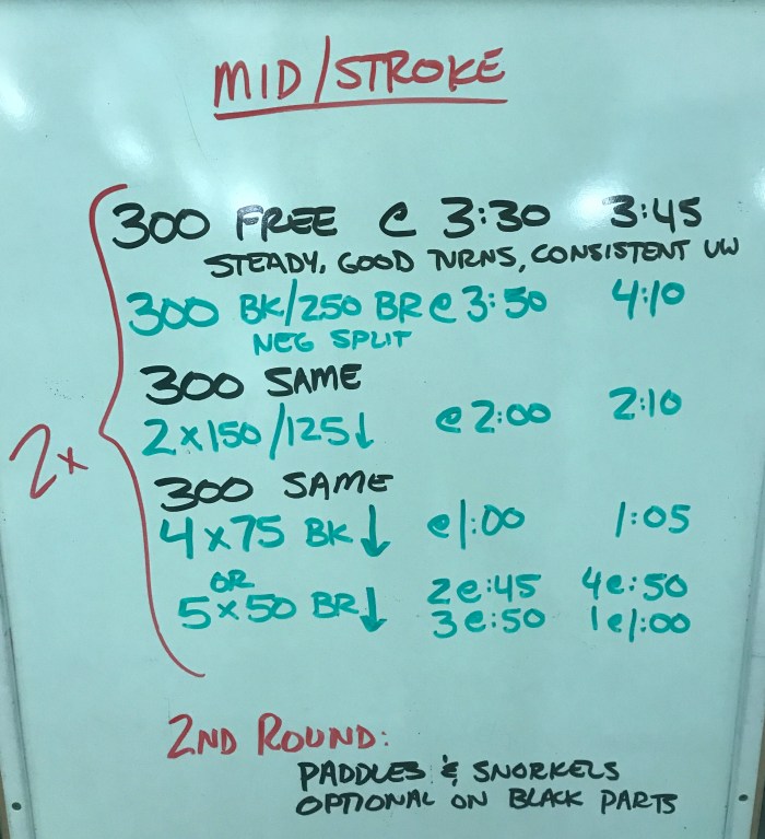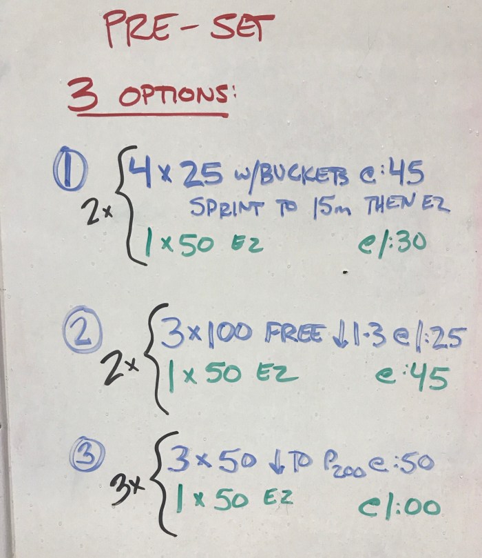 Last week before our Quality Set, we did a pre-set after warmup to make sure we had our engines really ready to go. I gave our swimmers options so that they could choose the one that could most help them.