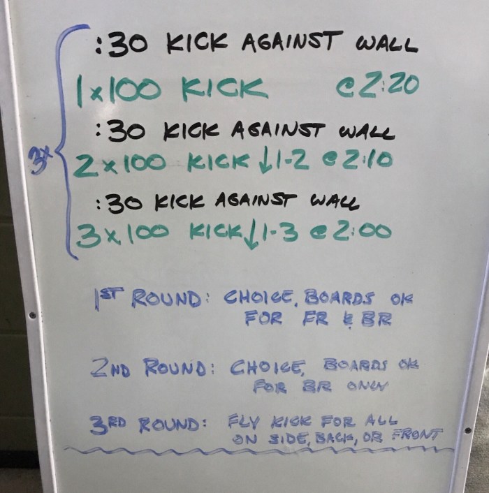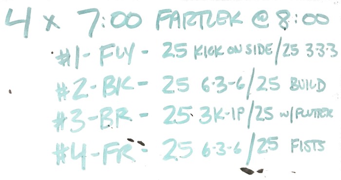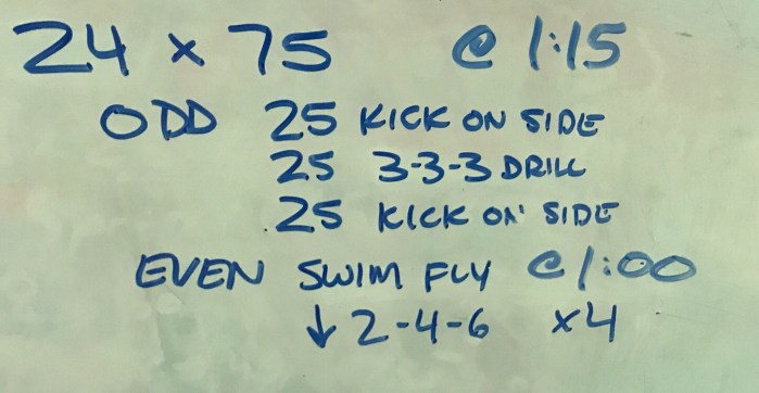 SCM. Today’s fly set included a bunch of other stuff. On the 8 x 200s, our top flyers did 25fly/175 free on number 1, 50 fly/150 free on #2, and so on up to a 200 fly on #8. The ‘B’ group went up to 100 fly/100 free and then started the cycle over again at 25/175.