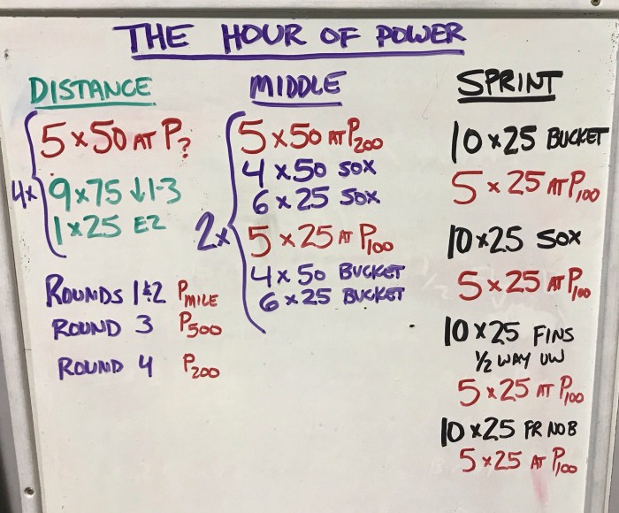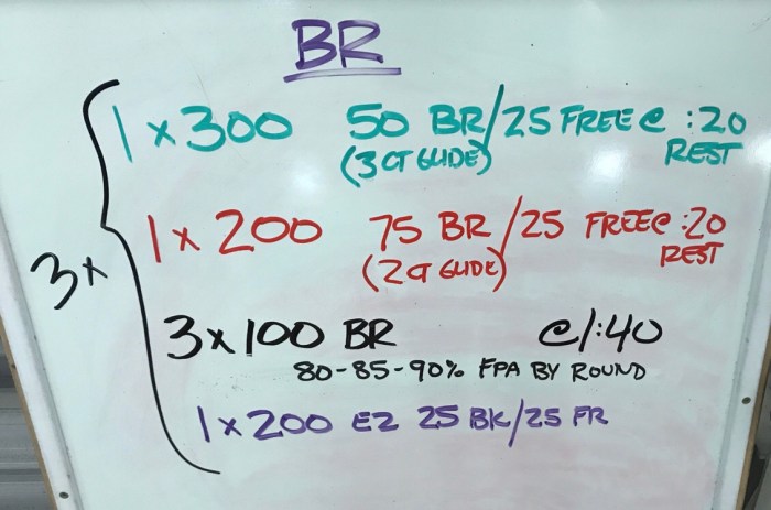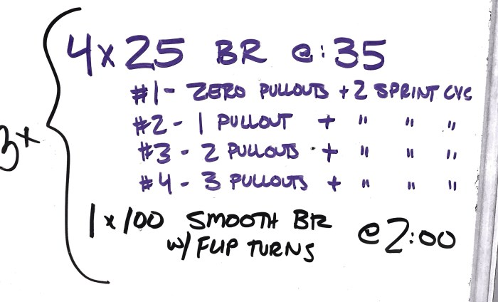 This set went really well for our middle-distance and distance freestylers. Those who have legitimate best mile and 1,000 times used those respective paces. Others who have only a legit 500 time used the alternative +2 and +1 paces for the first two parts.