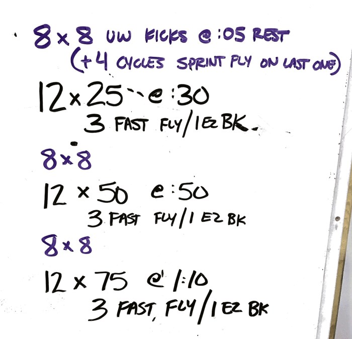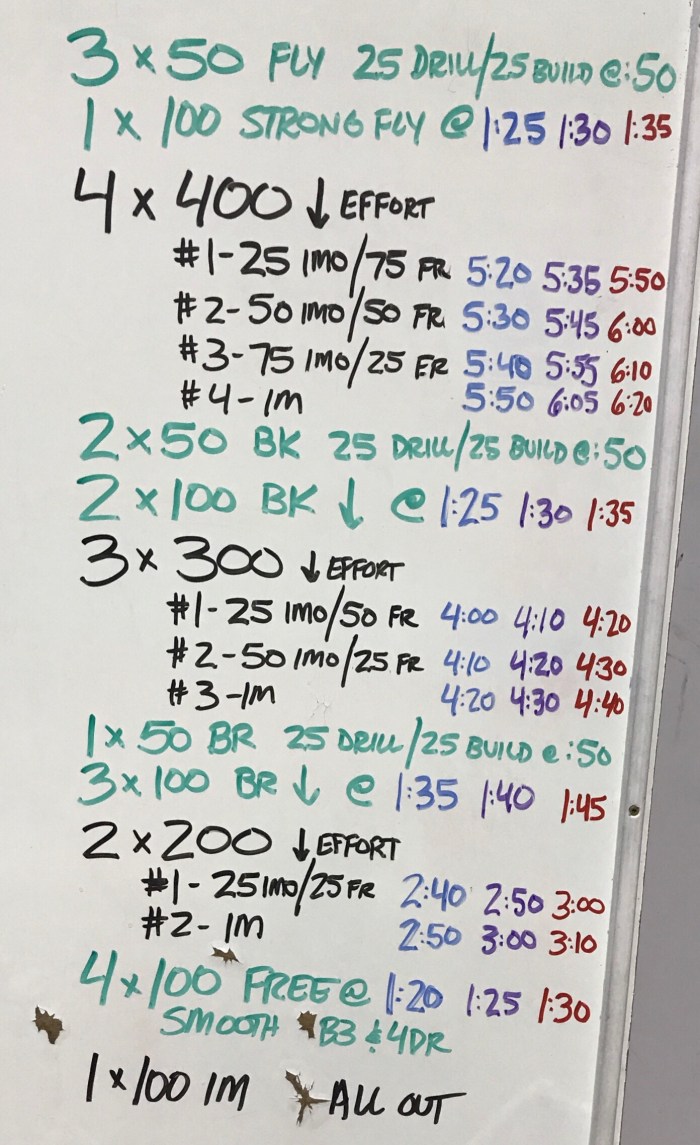 Swimmers had two options for strokes. They could either pick a stroke and stick with it for one round (6x100s). Alternatively, they could choose the “IM option,” doing all four strokes in IM order but tripling up on their best individual stroke.