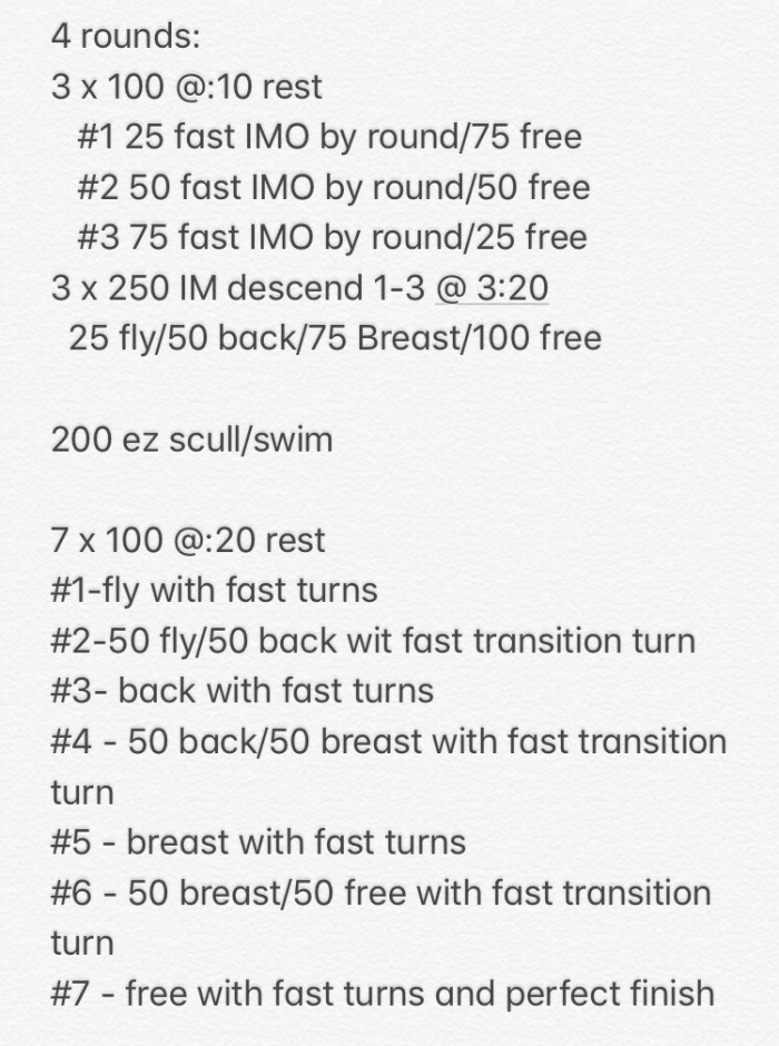 This set was a challenging one for our crew… we had about 50% success with the 100s at P400IM. At the conclusion of this set, we took about 2:00 rest and then did a broken 200 IM. 👍🏻👍🏻👍🏻