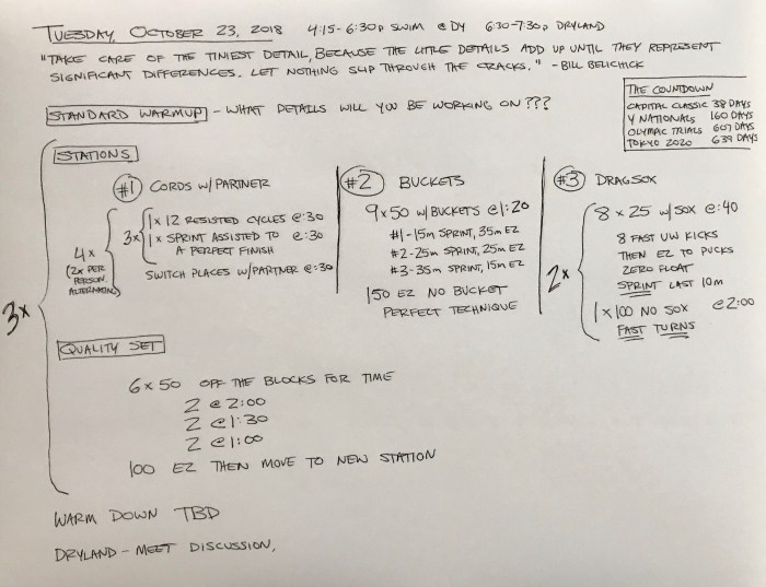 For this workout, we combined 3 power stations with a set of 6 x 50 off the blocks. We did it three times through, meaning each swimmer did each station once and the 6x 50s set three times. It was a good day for us — team energy and spirits were high, performances were good, and we spent time during our subsequent dryland discussing the previous weekend’s meet.