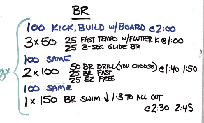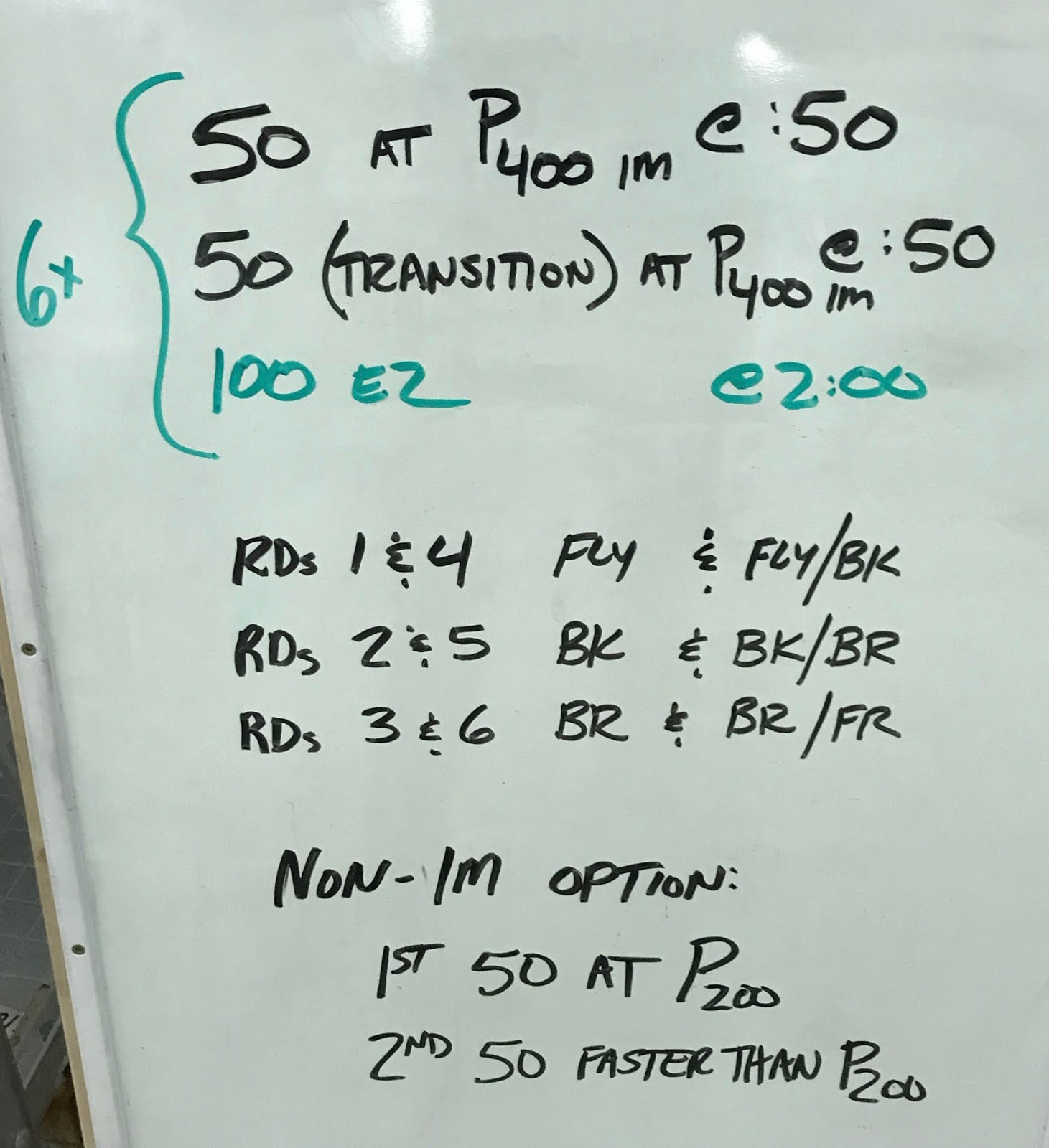 1 x 175 fast — 25 no free/25 free, goal is to beat your best 200 SCY time of the non-free stroke