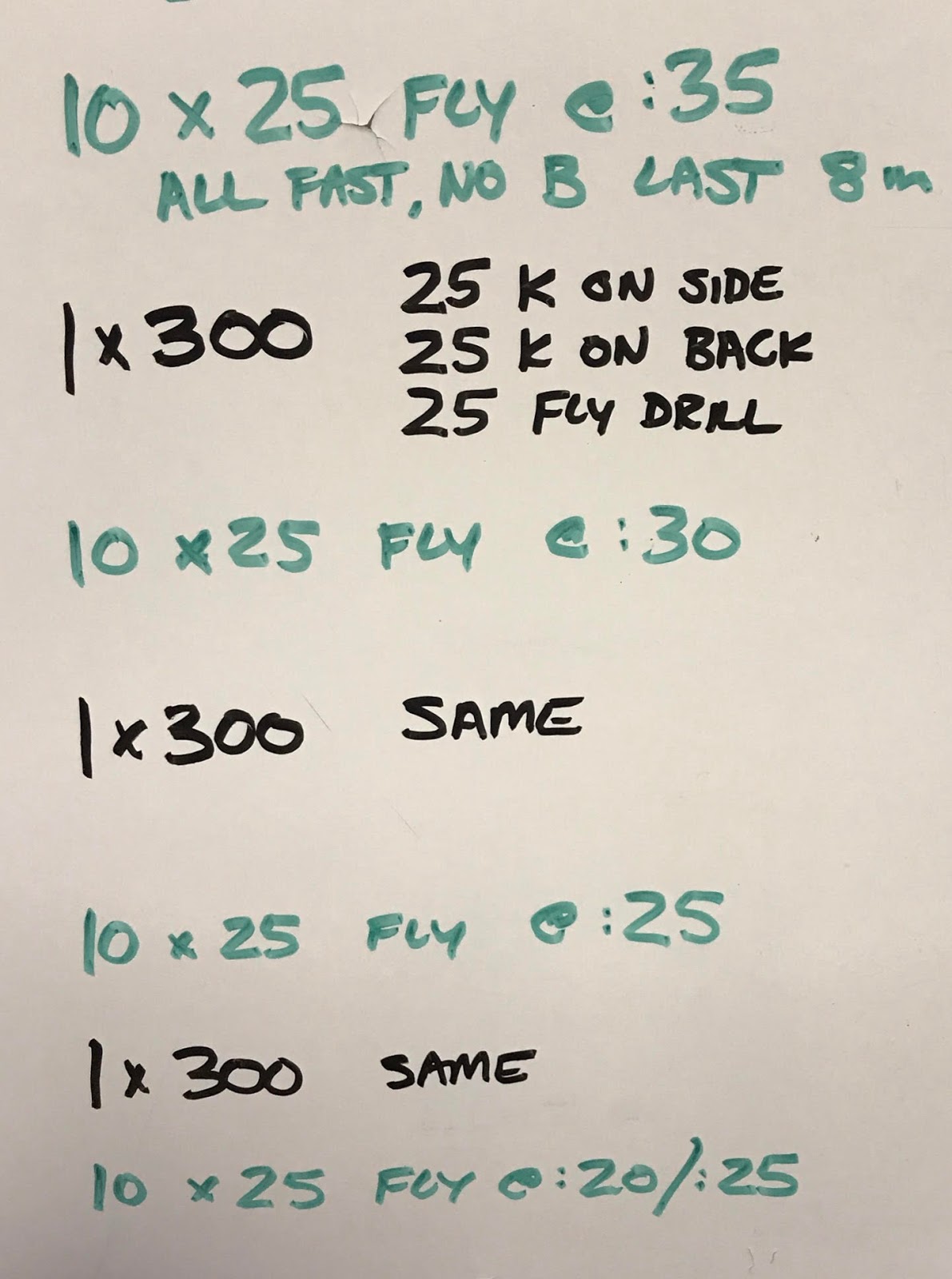 We had 26 athletes and 5 lanes, so in order to avoid a drafting effect and allow for decent fly swimming without having to dodge teammates, we performed the 175 in 4 lanes with half of the group while the other half swam the 125 easy in the 5th lane.