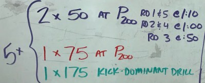 This was a really good set for us… The 2 x 50 at 200 pace is relatively easy to make on the first 2 rounds, but it is immediately followed up with the challenge of making the 75 (oof!). The 175 is just active recovery, getting them to remain technique-aware while using the legs. The changing interval on the 50s ups the ante for the middle rounds and then eases up again for the last round to have them finish on successful note.
