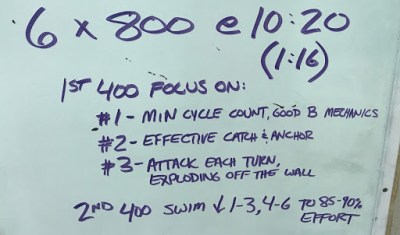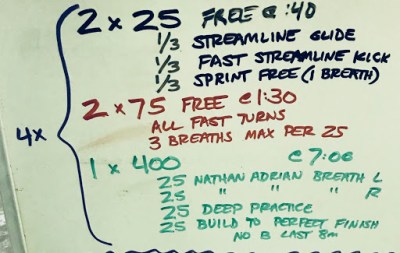 On every 25, we enforced zero breaths in the last 8m of the race. We use these orange hockey pucks on the bottom of the pool to mark the 8m distance. Penalty for a breath in that zone was the entire group starting that set of 10 over again.