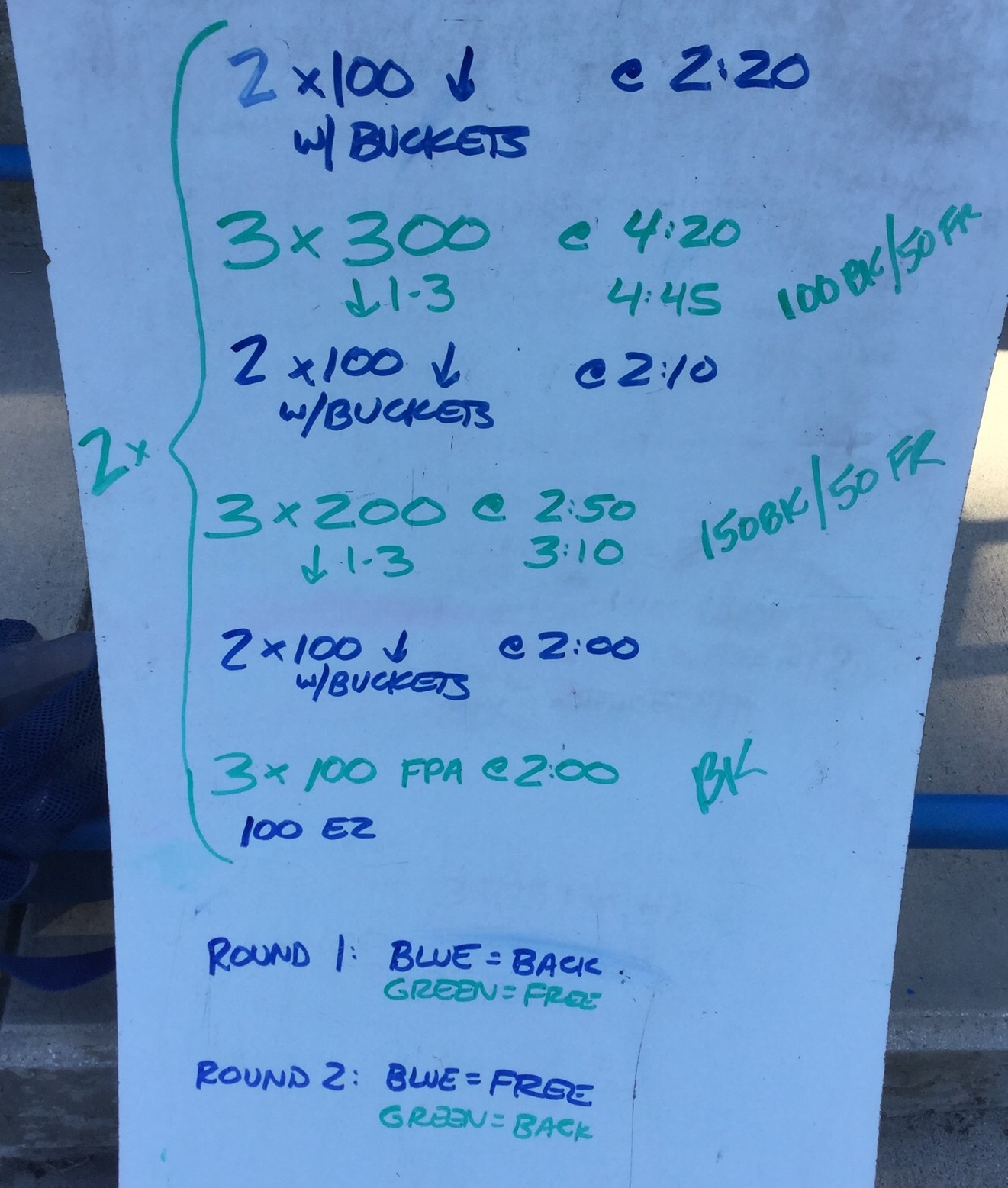 2nd time you miss an interval: Take 1 x 100 off, then put fins on and continue