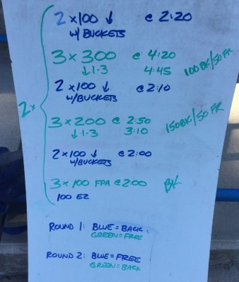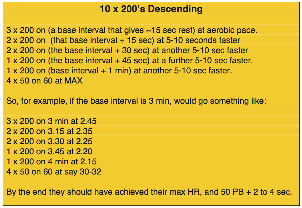 We used this set to challenge our swimmers ability to repeat/hold a swimming pace. It made for a excellent set yesterday.