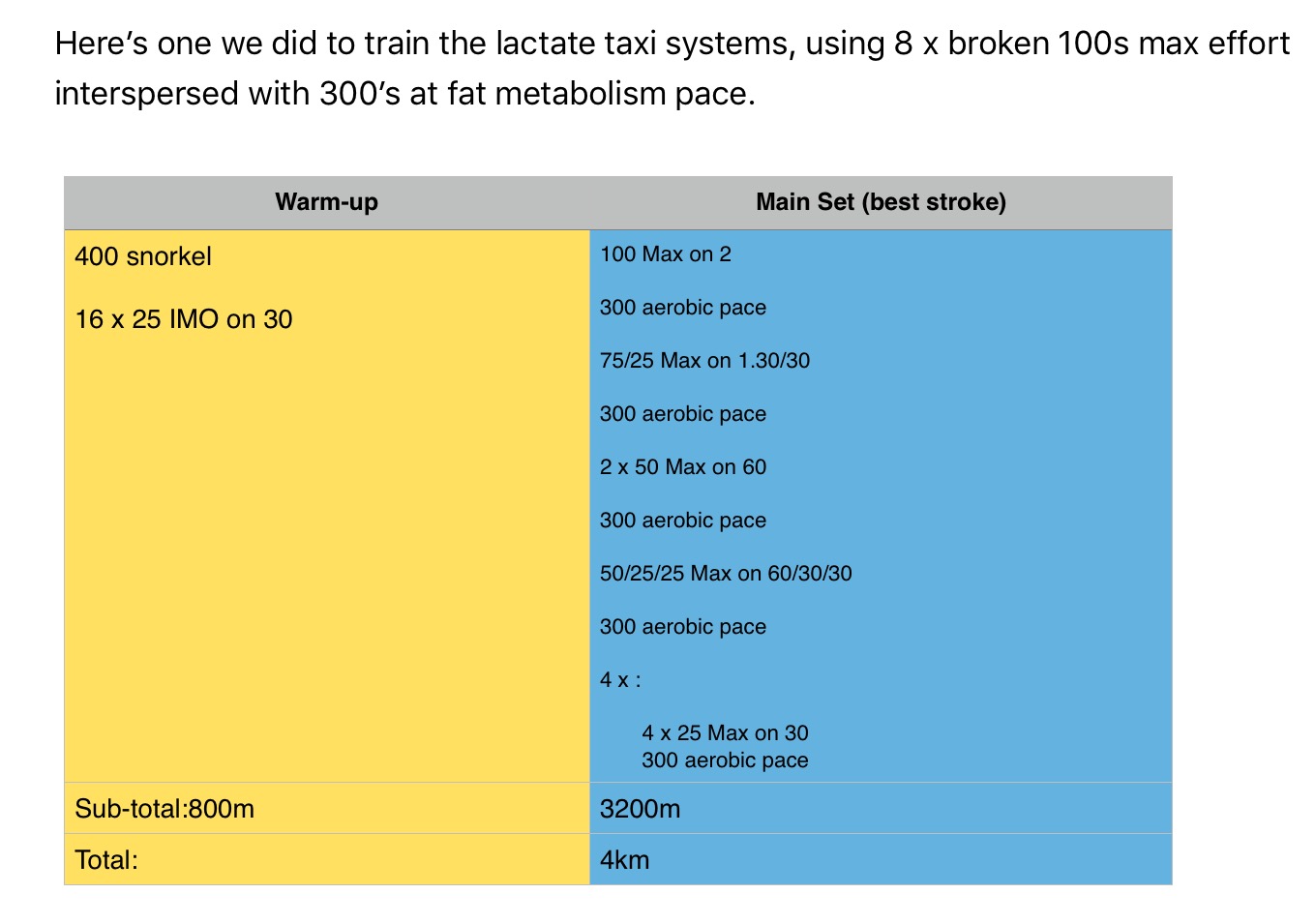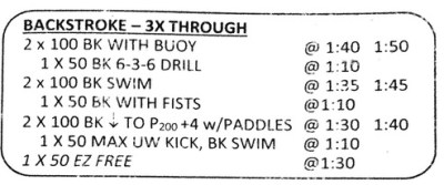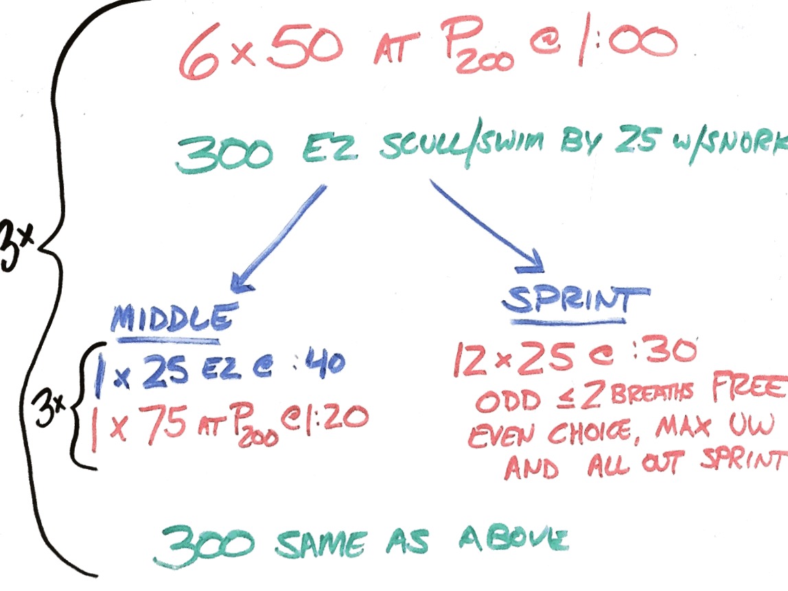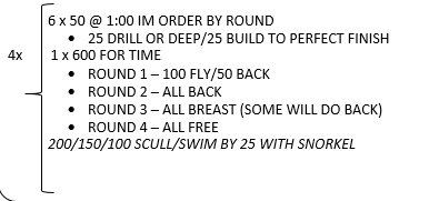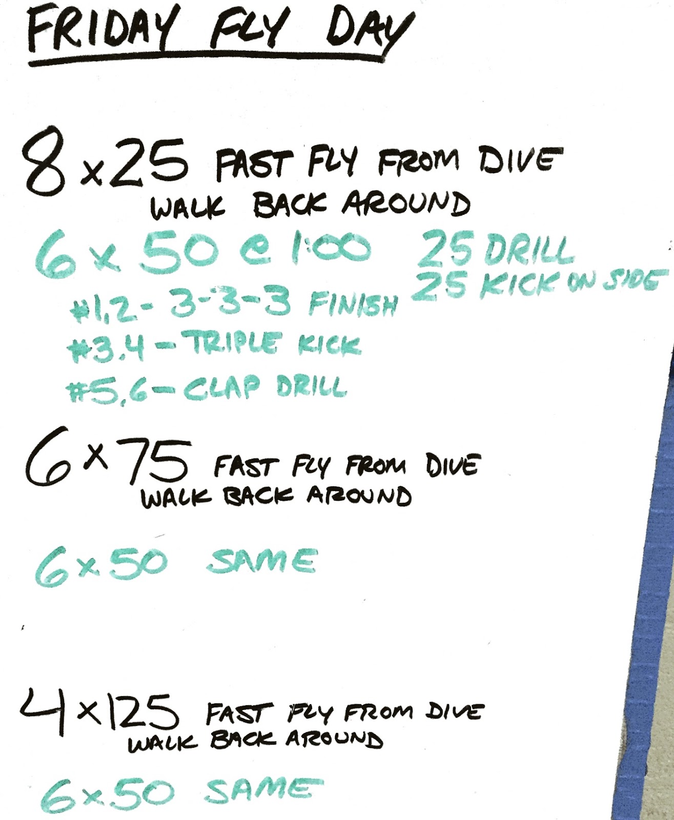 It is critical to train fly with excellent technique or it becomes what I call “butterstruggle” and is counterproductive. This set allowed is to get a decent volume of fly in while keeping it in manageable chunks. We allowed two versions of the set: The A is for our strongest flyers. The B is for our non-flyers or flyers without as much strength. Doing the set in “zipper” fashion allowed us to never half to “fly-dodge” or take one-arm strokes.