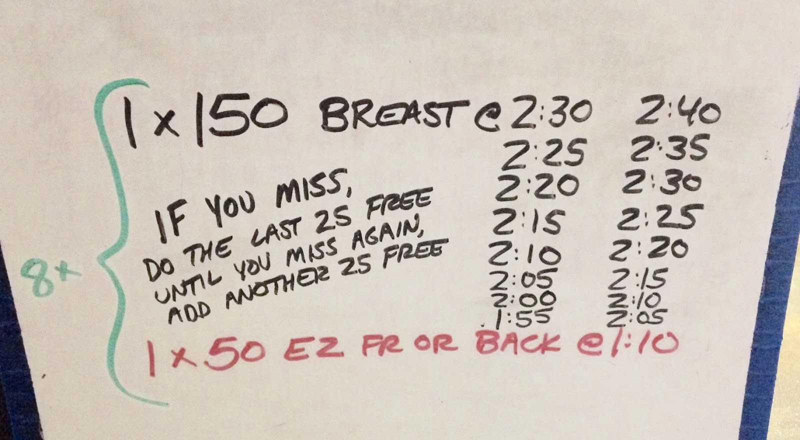 This was a good SCM set for our whole group to do. As with most groups, we have a wide variety of breaststroke abilities and speeds. This set allowed us to keep them all together. Swimmers simply substitute a 25 of free for breast at the end of the 150 if they missed the previous interval.
