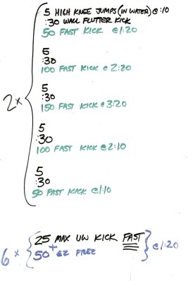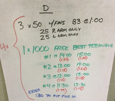 This set was a follow-up to a previous post. Very similar, but I tweaked the set to make it a bit more challenging. I also added a fourth interval to better suit a few swimmers. Our milers did the whole set, others stopped at the dotted green line. Intervals were for SCM.