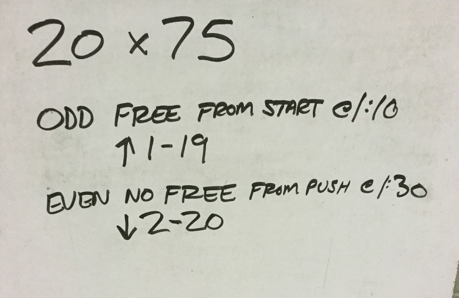 75s are timed to the feet.  We used our pace cards to determine Goal and Best Time 75 pace for 200 events.  If swimmer achieved Goal 75 time, he scored 2 points for the team.  If he achieved Best Time pace, he scored only 1 point for the team.  Instructions were that we would do as many rounds as it took for the team to score 120 points (15 swimmers).  We finished in six rounds.