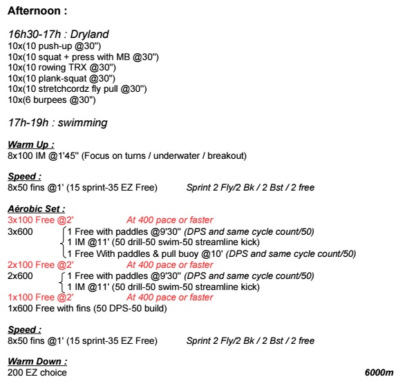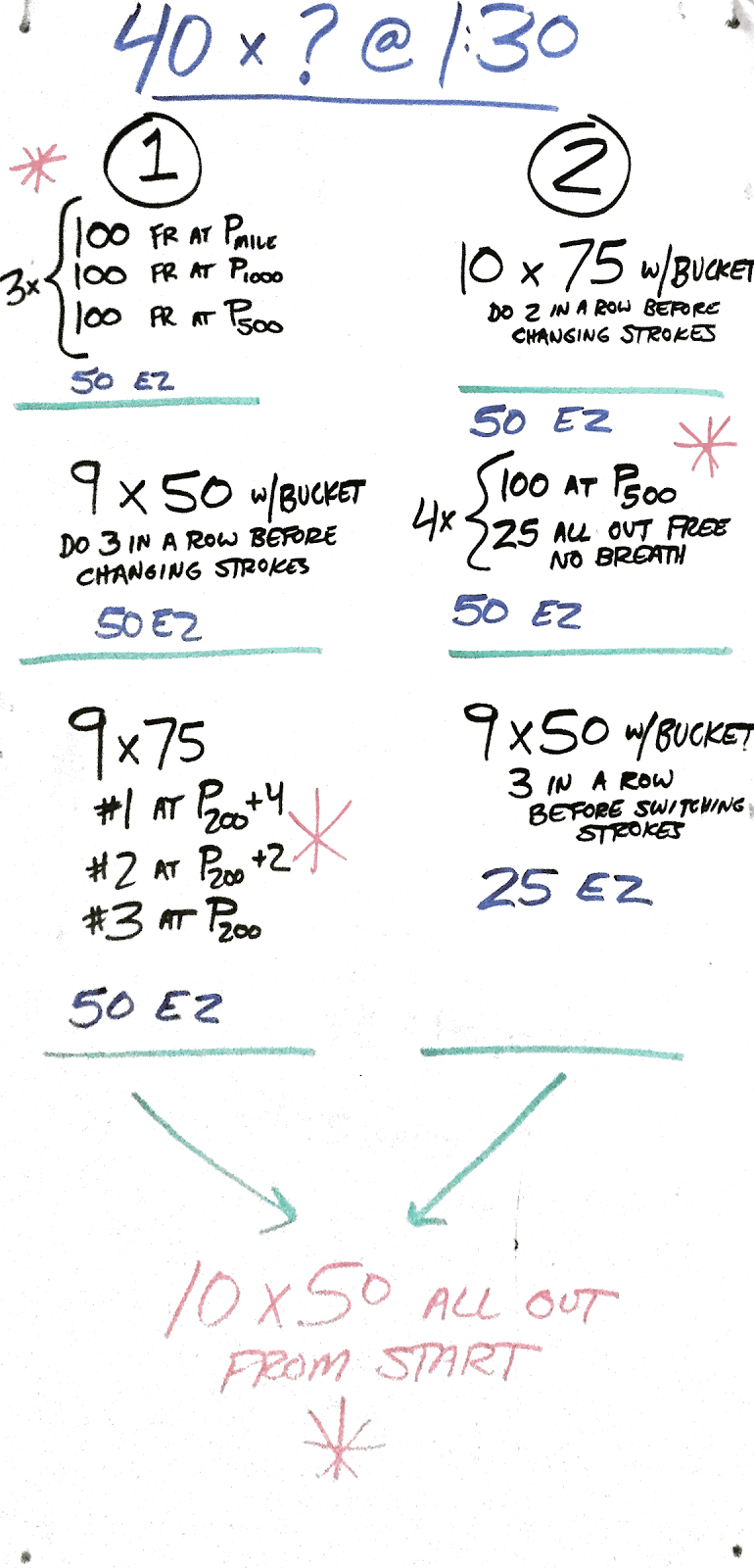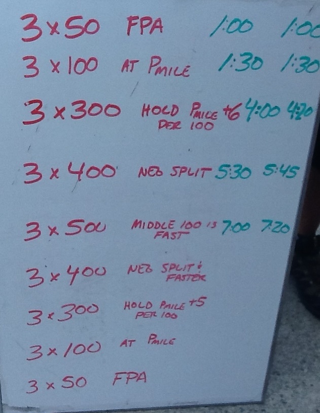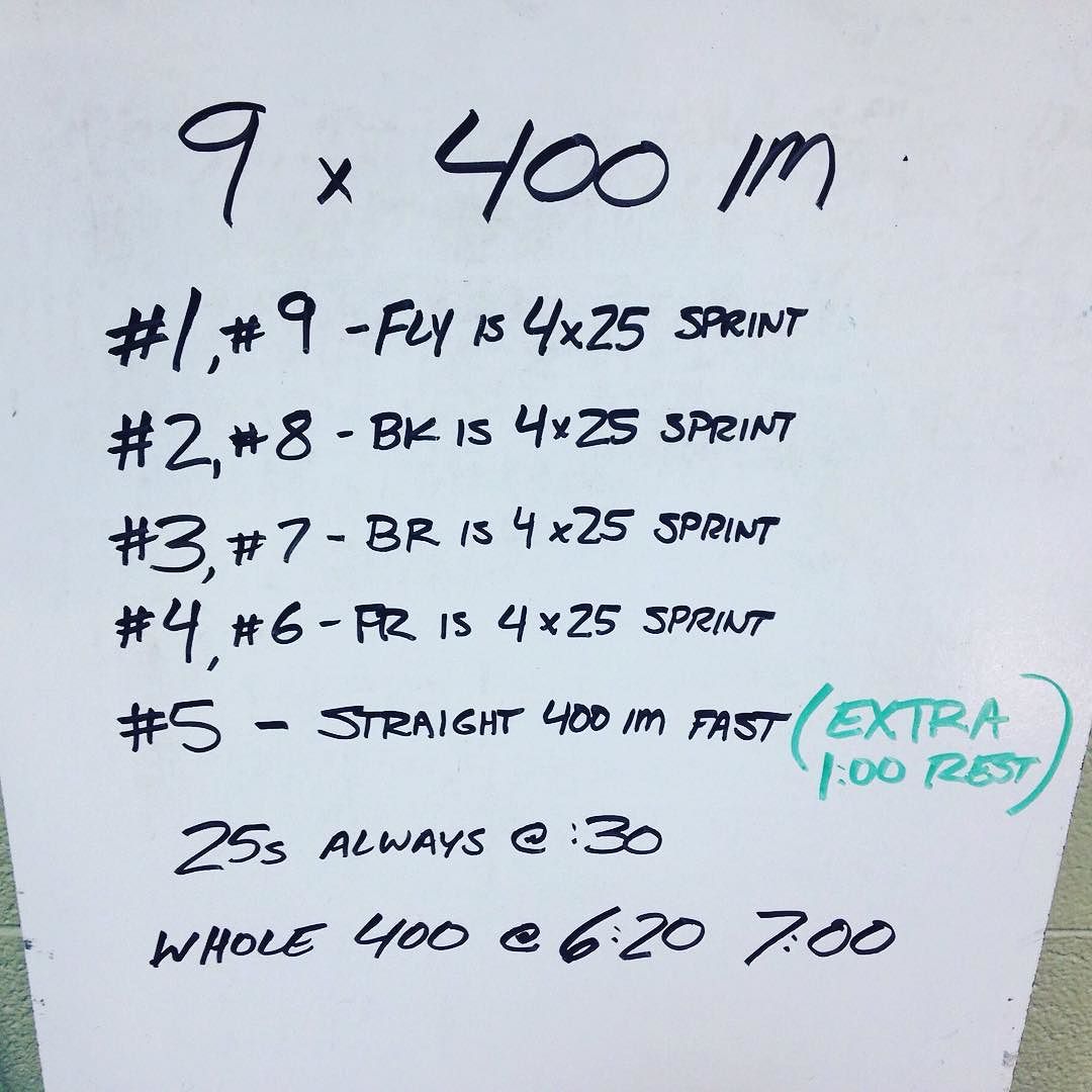 This was a one hour set focused on intense quality and race pace swimming.  Swimmers focused on 200 & up events did the left column, swimmers focused on 200 & down did the right column.  It went well, but if I could do it again I would restructure the first 10 swims for Group 1 to give them a bit more rest.