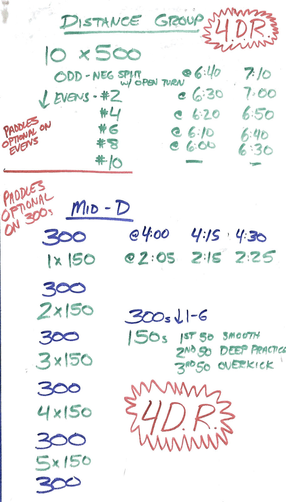 Freestyle main focus today.  Splitting the group into “true distance swimmers” and mid-distance folks doing some aerobic work. “4.D.R.” refers to the 4-Dolphin Rule, swimmers must do 4 dolphin kicks off every wall.  4.D.R. was an idea I picked up from a podcast I listened to this summer with Tony Batis of PASA.