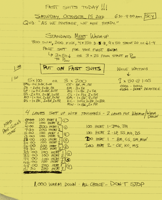 Typically twice per short course season (once in the fall, and once in Jan/Feb), I have our older swimmers bring their old “tech suits” to practice one day to wear during a quality set.  The aim is three-fold: