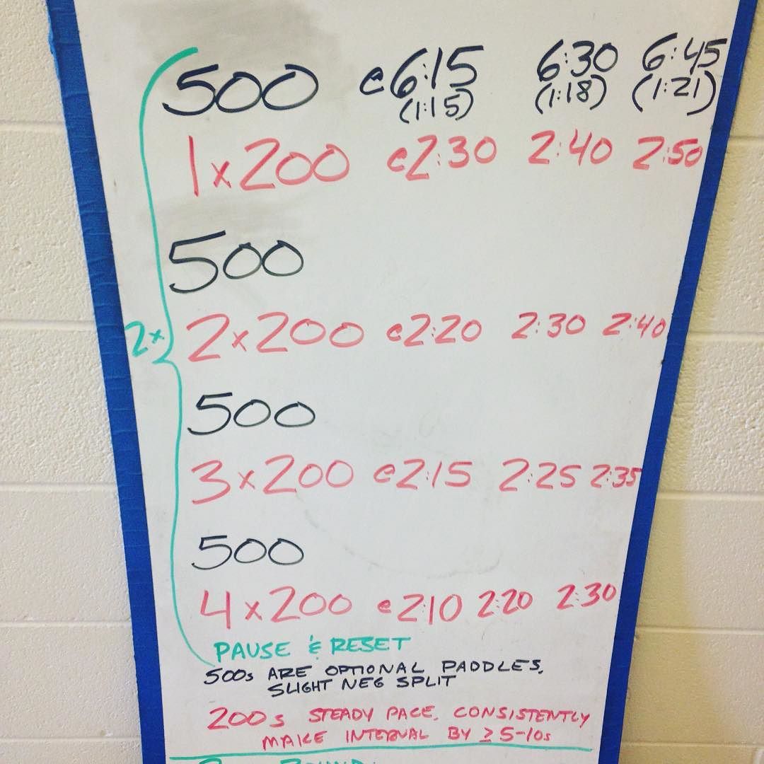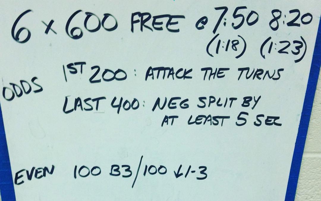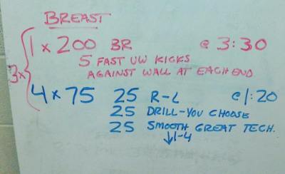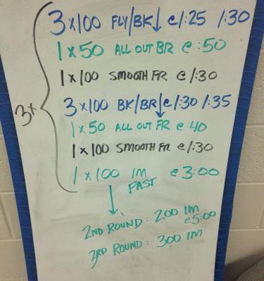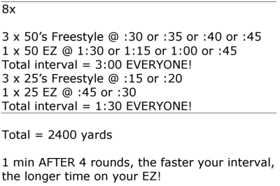 We did this challenging set yesterday, and our swimmers really did well. I liked how not only did they swim fast, but their confidence seemed to rise when they were done. Success leads to more success!