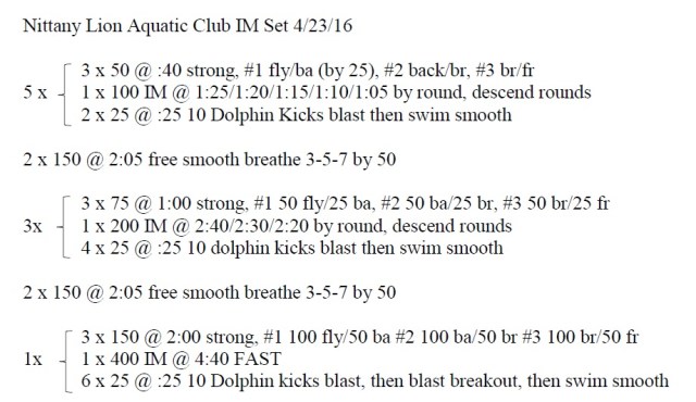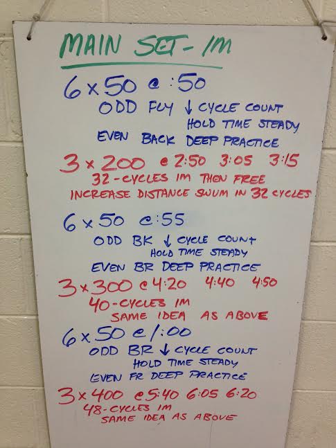 – 2 x 50 @ :55 – 10 seconds all out wall kick, flipturn, then swim the 50 mini/max (maximum speed with minimum number of strokes)