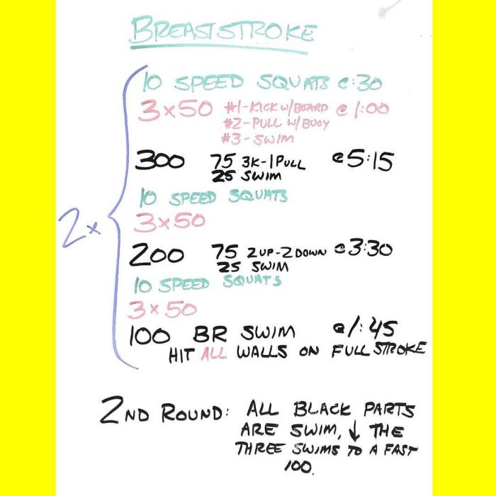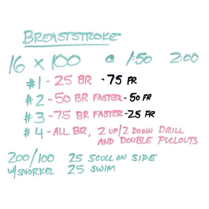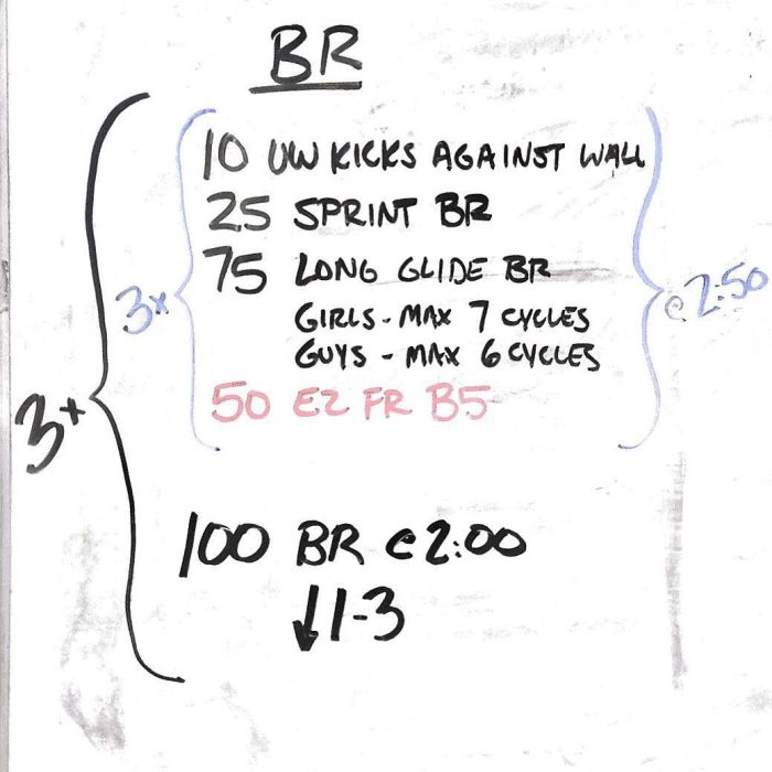 The purpose of this set is primarily to improve a swimmer’s capacity to do an effective Br pullout and sprint while fatigued. The 10 underwater breaststroke kicks (NUCLEAR INTENSITY!!!) are performed pushing against the wall at a depth of about 1m with the hands pushing against the wall. Then WITHOUT COMING UP TO BREATHE, the swimmer pushes off into the 25 sprint breaststroke. The 25m sprint is importantly followed by very smooth and efficient “long-glide” breaststroke on a maximum cycle count.