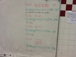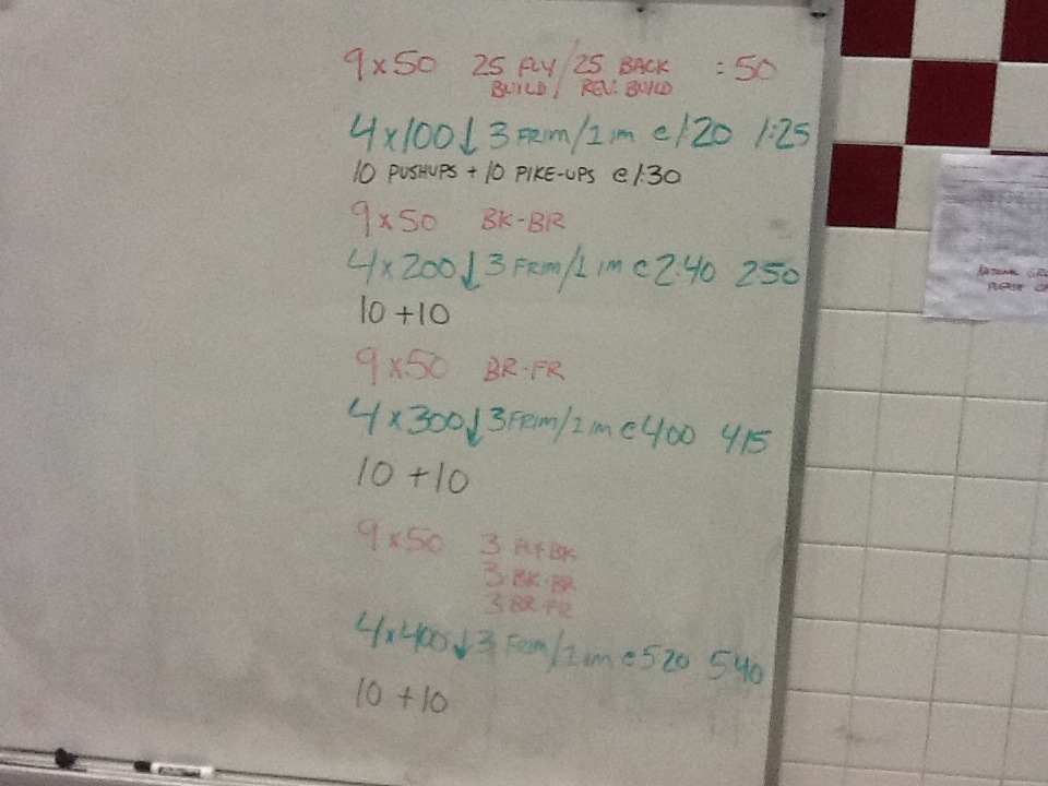 3 x 200 @ 2:20 descend, essentially the reverse of what was done on the first 3, same draft line and swimmer rotation