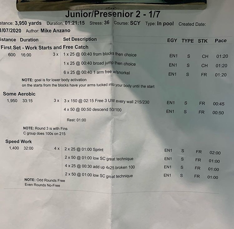 This was our SCY workout this morning. The race pace set at the end came from Mike Anzano of COM Aquatics