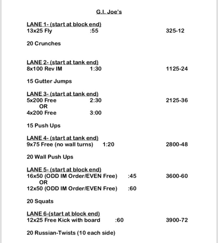 I do a set called GI Joes. It’s like stations with dry land in between. Fun, quick yardage that is easy to get in, and it’s always changing so there is no reason to get bored. Warm up for that, could be 4×200 Swim/Drill or 3×300 Swim/drill/kick. You get the idea.