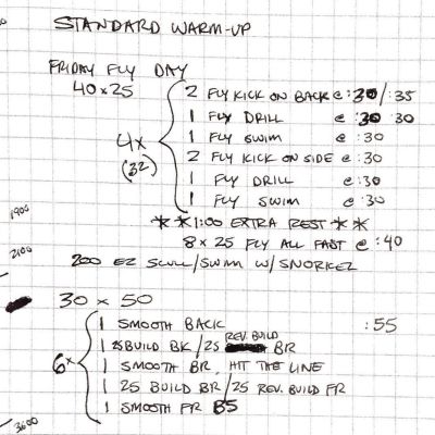 We performed this set in a SCM pool, same as for most of the sets I post during the September-May time period. In this one, the time expectation of beating our best 500 SCY time during each 400 was key to the success of the set.