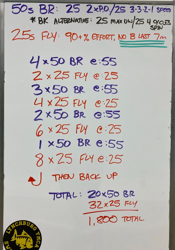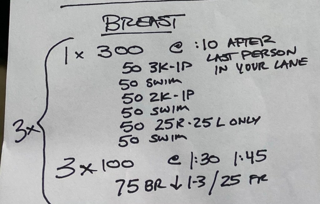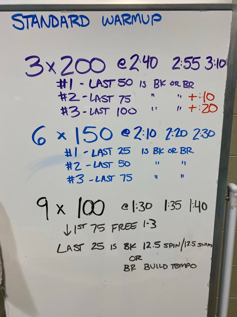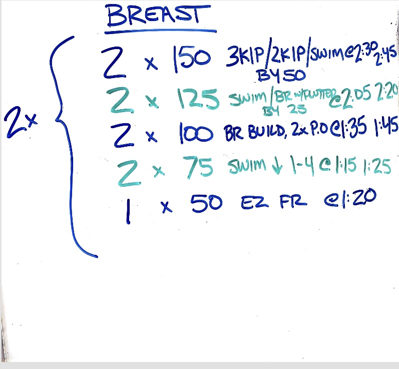 Many breaststrokers struggle on quality sets if they haven’t had a significant amount of breaststroke-specific warmup. This one was a bit of a pre-set specifically aimed at getting the br crew going.