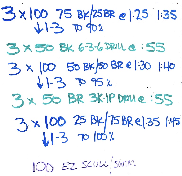 Our breaststroke group did this set recently as preparation for our main race pace set. This set seemed to flow well and then we really had some great results on the race pace set (which I will post tomorrow).