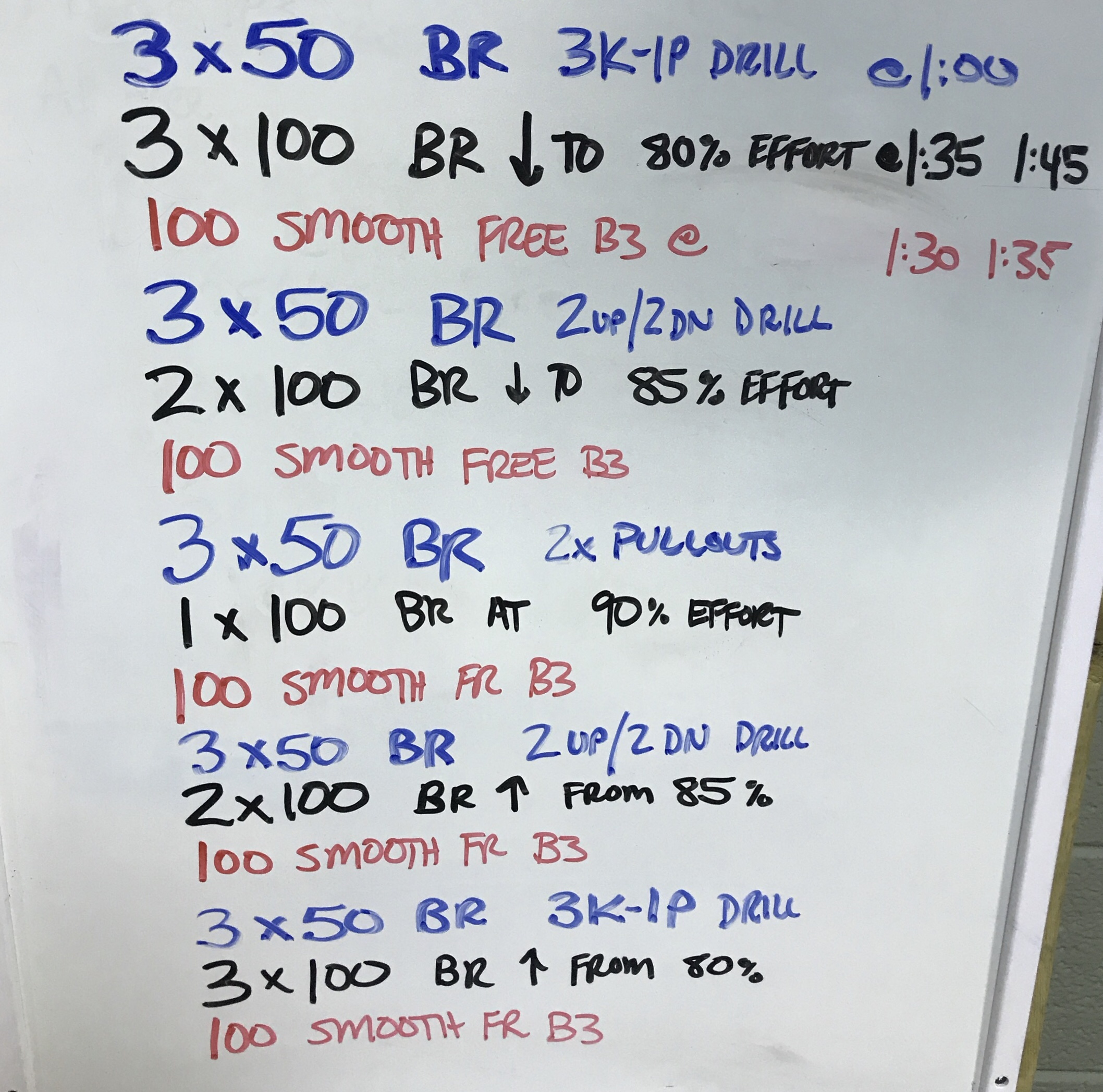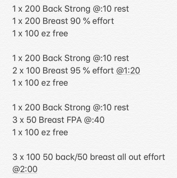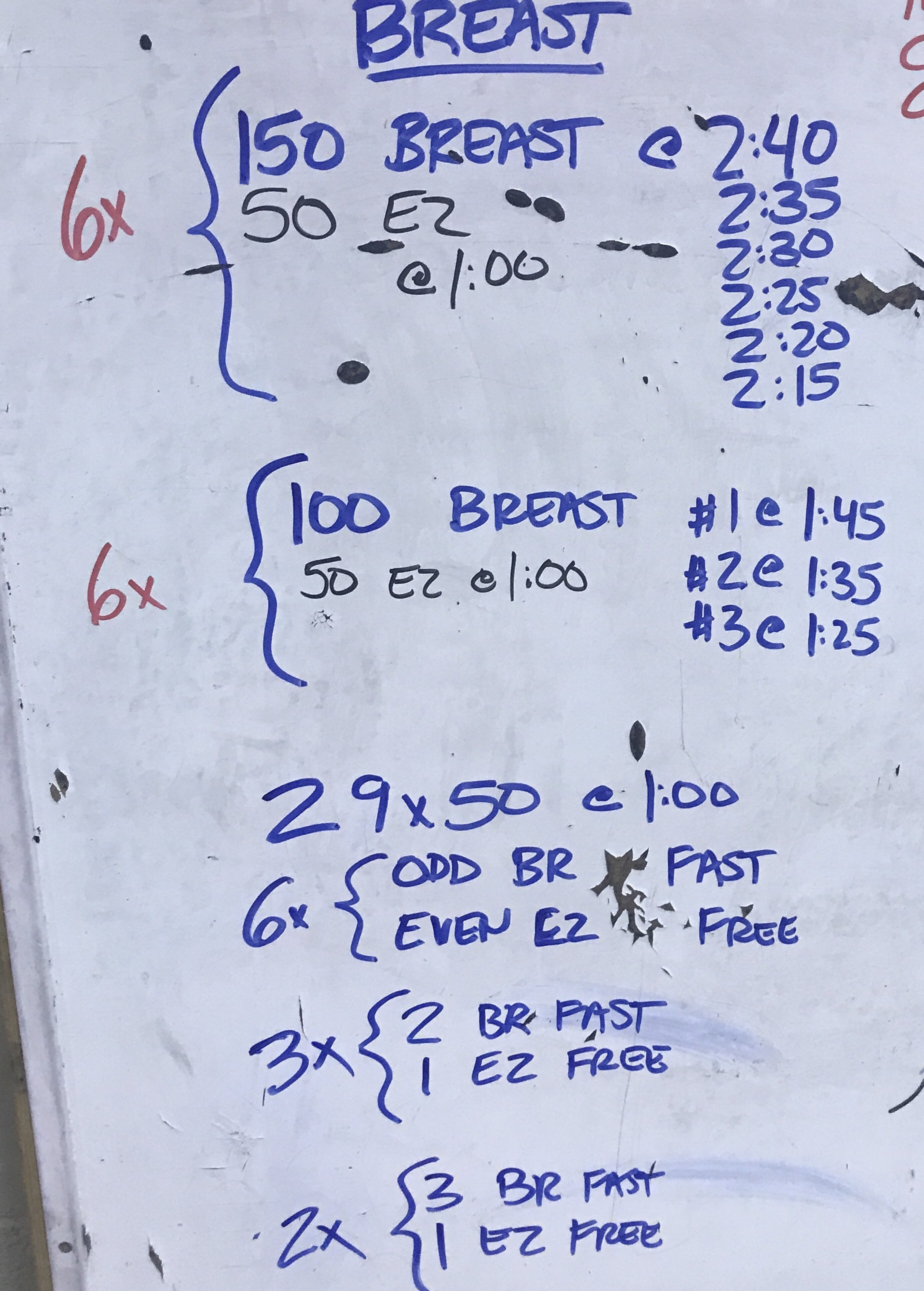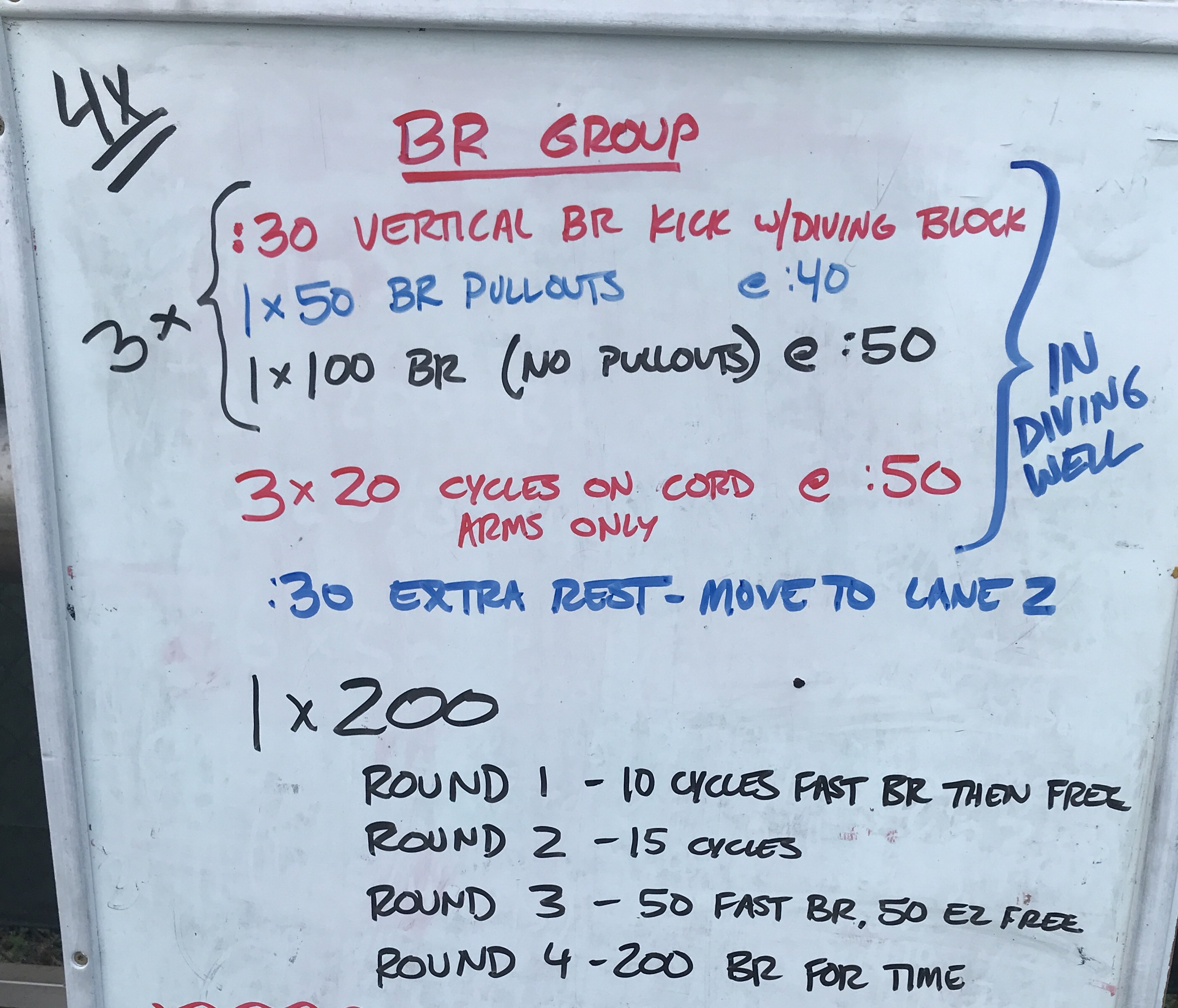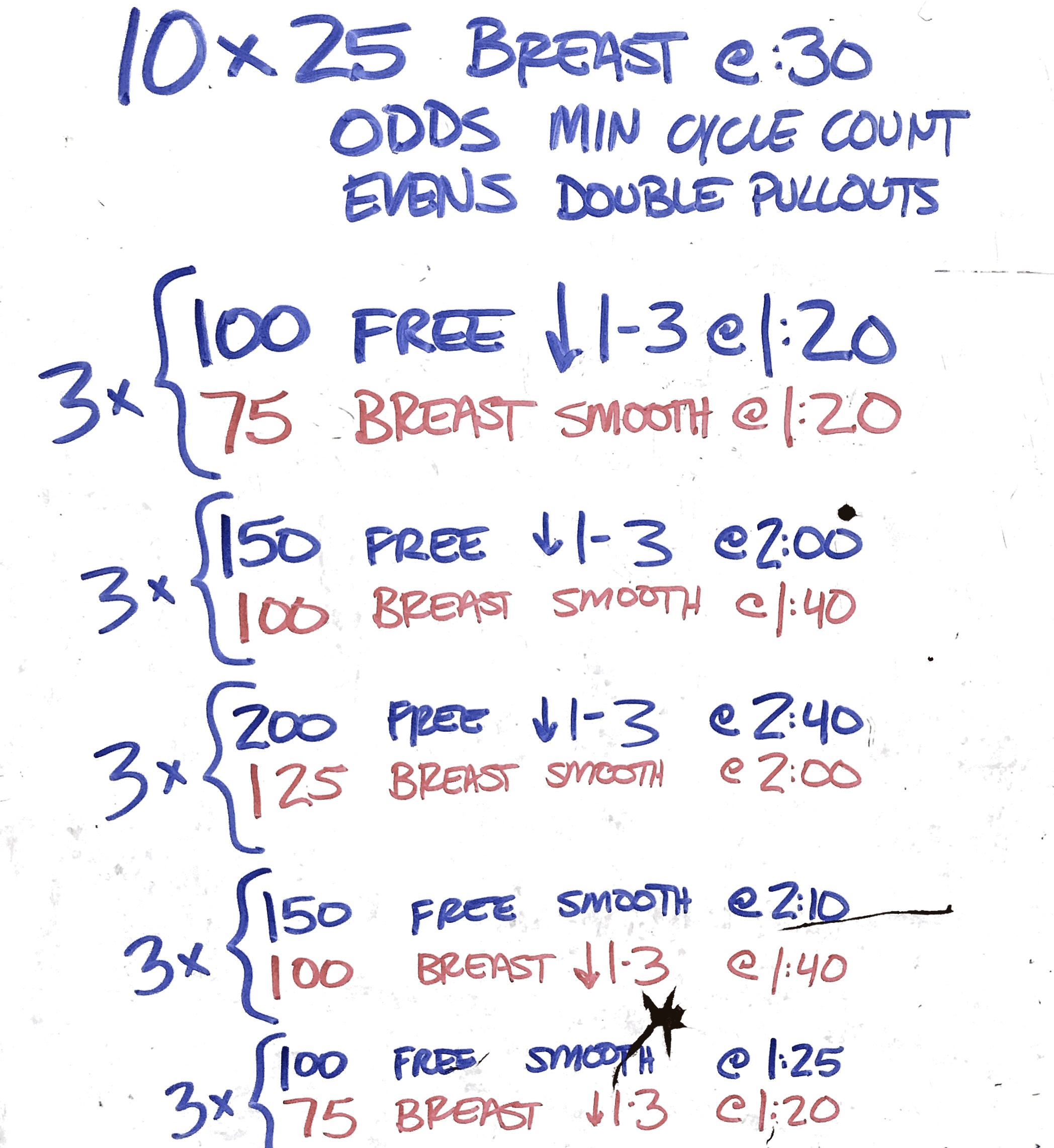 The first part of the set helped to reinforce good breaststroke technique, distance per stroke, etc. In the second part, we try to maintain cycle count over progressively longer distances at near race speed.
