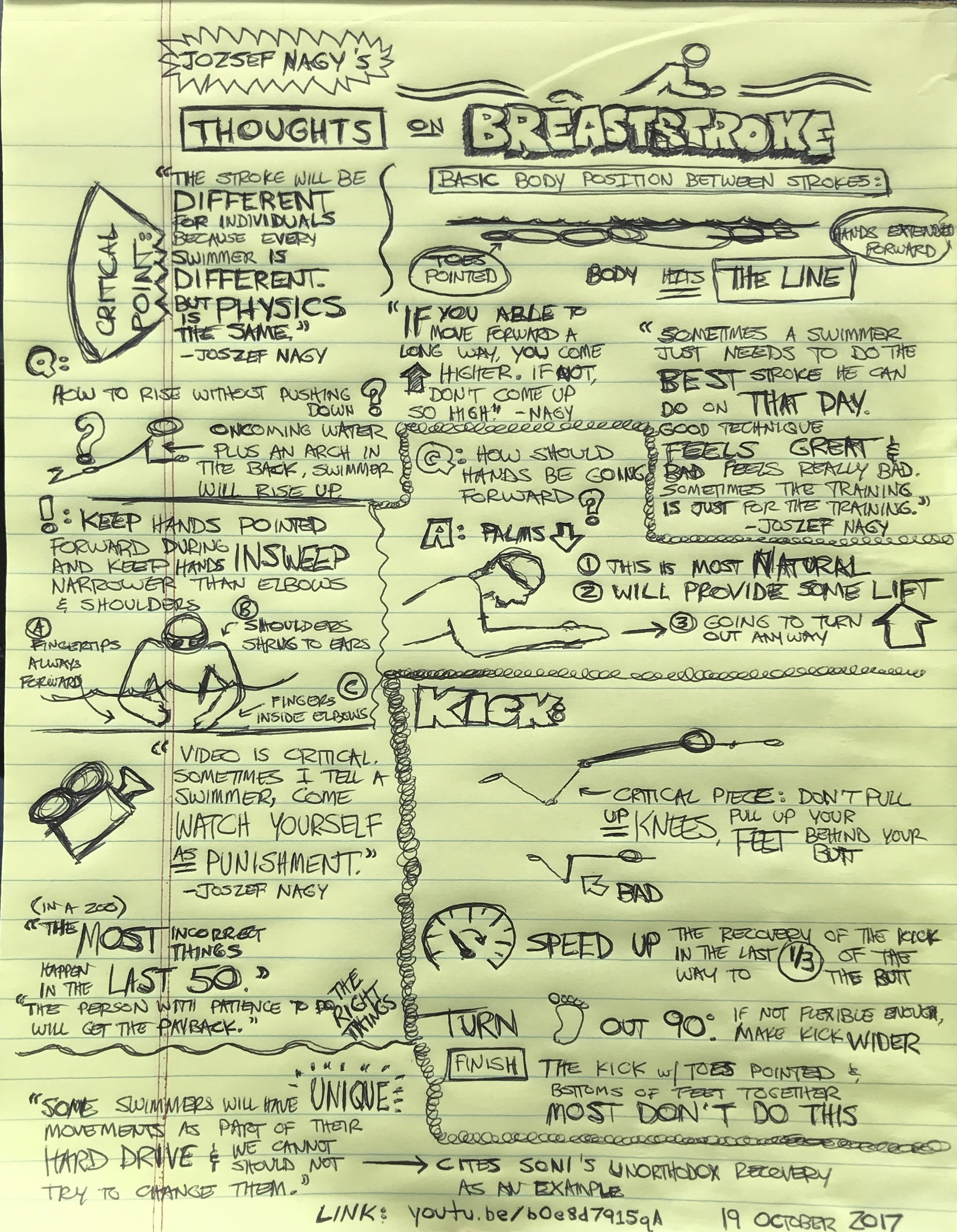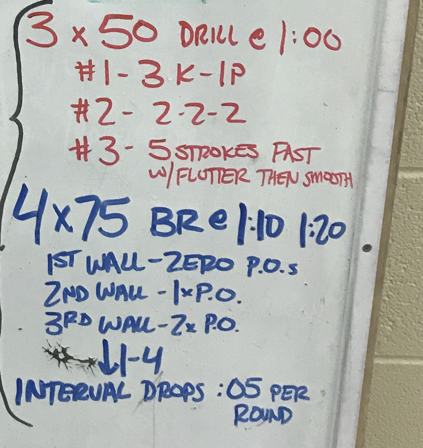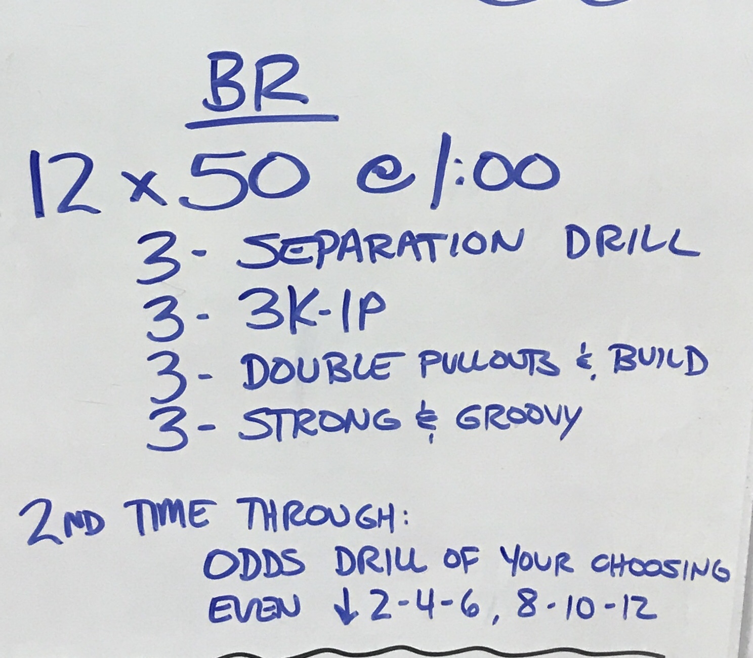 These non-stop 6:00 swims repeated the instructions within the 6:00. At about 5:00, coach would yell “Go!” signifying a FAST 50 breast starting immediately.